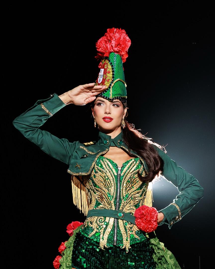 Мисс Португалия Камила Виторино показала силу и красоту португальской женщины. Национальный костюм, созданный António da Silva, отдает дань уважения Celeste Caeiro - португальской коммунистке, которая раздавала гвоздики солдатам, которые шли свергать диктатуру в Португалии. Этот поступок стал символом революции, которая получила название «Революция гвоздик». Сочетание военной формы и гвоздики на костюме подчёркивает послание: преврати конфликт в надежду. Это празднование тихой храбрости, которая помогла построить новую главу в истории Португалии.