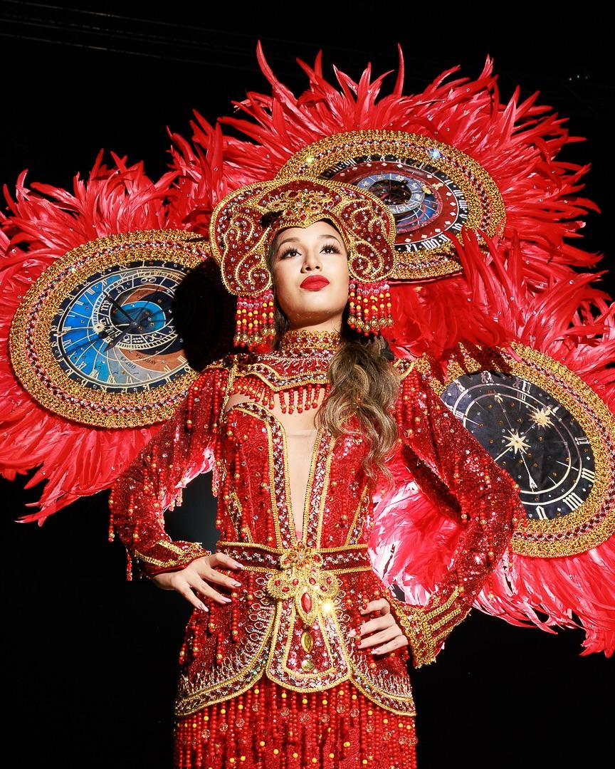 Мисс Швейцария Наима Акоста в костюме с астрономическими часами Берна с перьями, символизирующими связь неба и земли, время, непрерывные перемены и его глубочайший смысл свидетельствуют о том, что мы все едины! Красный цвет платья символизирует швейцарский флаг, а золотой — богатство страны. Наряд 20-летней девушки был вдохновлен швейцарской часовой индустрией и башней с часами Zytglogge в Берне. Акоста выросла в Швейцарии и Мексике. Сейчас она получает образование в области гостиничного менеджмента.