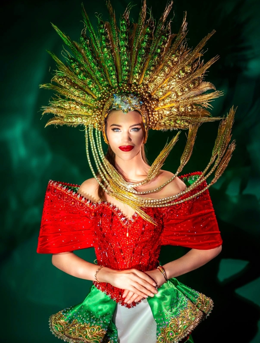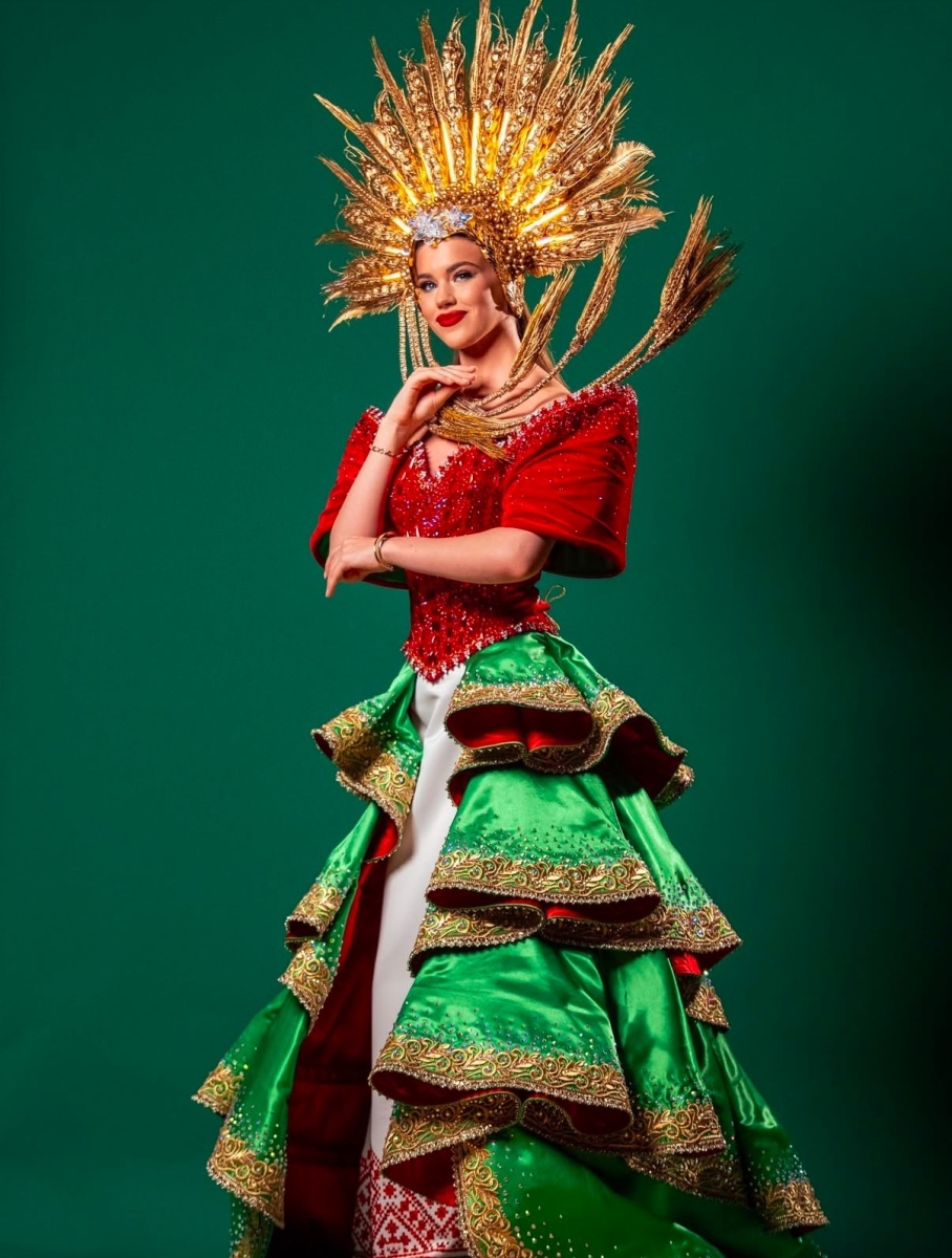 Мисс Беларусь Алена Кучерук. Костюм вдохновлен богатой символикой государственного герба и флага страны. Центральным элементом декора выступает стилизованное изображение герба, где древние символы мудрости и силы переплетаются с природными мотивами белорусской земли. Каждый элемент костюма - от изящного кроя до мельчайших деталей вышивки - рассказывает о богатой истории и культурном наследии белорусского народа, воплощая в себе дух Республики.