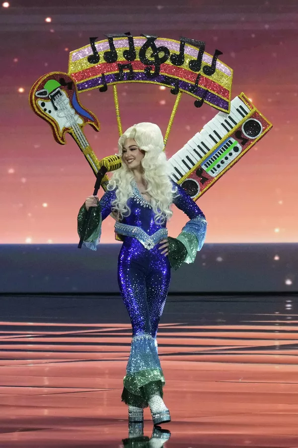 Мисс Швеция Даниэлла Лундквист в костюме «Танцующая королева на сцене Вселенной!" в стиле культового шведского ансамбля ABBA. Этот образ — не просто мода — это дань уважения музыке, которая заставила петь весь мир.