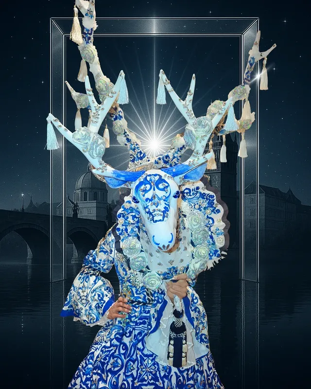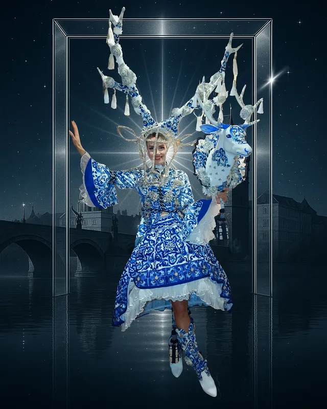 Мисс Чешская Республика Микаэла Томанова в костюме «Голубоглазая девушка». Этот национальный костюм отражает чешское мастерство, красоту и дух. Он был создан из богато сотканной парчи и украшен сотнями чешских кристаллов — крошечными огоньками, которые, кажется, несут отражение рек, лесов и звёзд. Центральный мотив — олень — крупнейшее и величественное дикое существо чешских лесов, а также фигура из легенд и сказок, появляющаяся там, где реальный мир касается мистического мира. Здесь олень символизирует силу, спокойствие и мужество идти вперёд, даже когда тропа ведёт через тёмный лес — как чешская душа, которая никогда не сдаётся и гордится с смирением. Силуэт костюма сочетает народную элегантность с современным воображением — деликатность кружева и вышивки сочетается с чистыми линиями современного дизайна. Рога превращаются в корону, кристаллы — в росу, а вся фигура излучает грацию и смирение — как голубоглазая девушка из чешской народной песни. Этот костюм — не просто одежда. Это отражение пейзажа с верой в то, что красота и гордость могут жить вместе в одном дыхании.