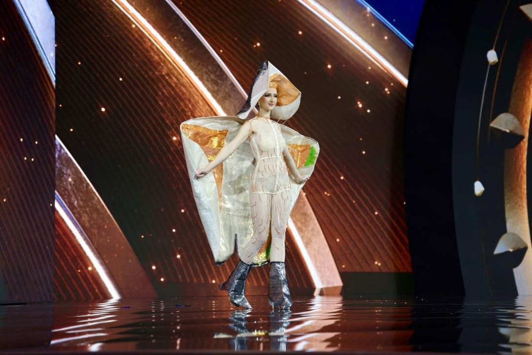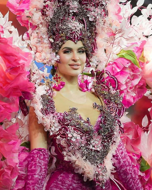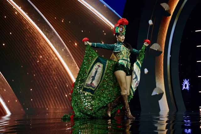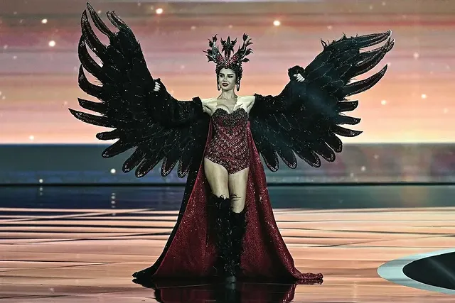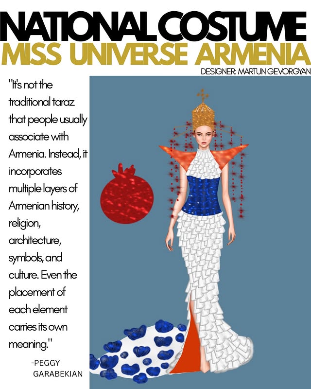 Мисс Армения Пегги Гарабекян в костюме, где каждый стежок несёт свою историю. Это не традиционный тараз. Это современная интерпретация, символический костюм, сотканный из фрагментов культуры, наследия, веры и природы Армении. Каждая деталь была создана, чтобы почтить историю и дух Армении, одновременно представляя её через новый художественный призму. Но у костюма слишком много элементов, которые борются за доминирование, слишком много значений сталкиваются, слишком много форм и текстур борются за внимание зрителя, создавая ощущение визуальной перегрузки и стилистической несогласованности. Купол церкви на голове, увенчанный крестом и сопровождаемый красными бусинами, символизирующими кровопролитие; наплечники, напоминающие доспехи, вызывающие ассоциации с боевой историей; бесконечные текстурированные слои, вдохновлённые «Каменной симфонией»; гранат; Цветок «Незабудка»; три священных письма; двенадцать колонн; флаговые элементы; блеск; пластмасса; металлические пластины; синий, красный, оранжевый, белый, золотой — каждый из них мог бы работать отдельно, если бы был подчинён одной визуальной идее. Вместо этого они сталкиваются, создавая неустанное ощущение перечисления, словно дизайнер не создаёт костюм, а пытается отобразить армянскую идентичность, поместив на него все символы, связанные с этой страной. Такая амбиция понятна — молодой дизайнер хочет сказать многое и громко. Но в моде, особенно в высокой сцене, сила заключается в выборе, в художественной сдержанности, в способности отказаться от лишнего ради усиления выразительной силы основной идеи.