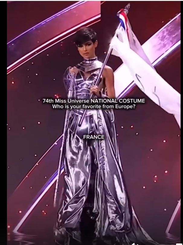 Мисс Франция Эв Жиль в костюме, который символизирует Жанну д'Арк: молодую героиню Франции. Эффект доспехов на теле символизирует воина, которым она была, белый флаг с голубем отражает её стремление к миру.