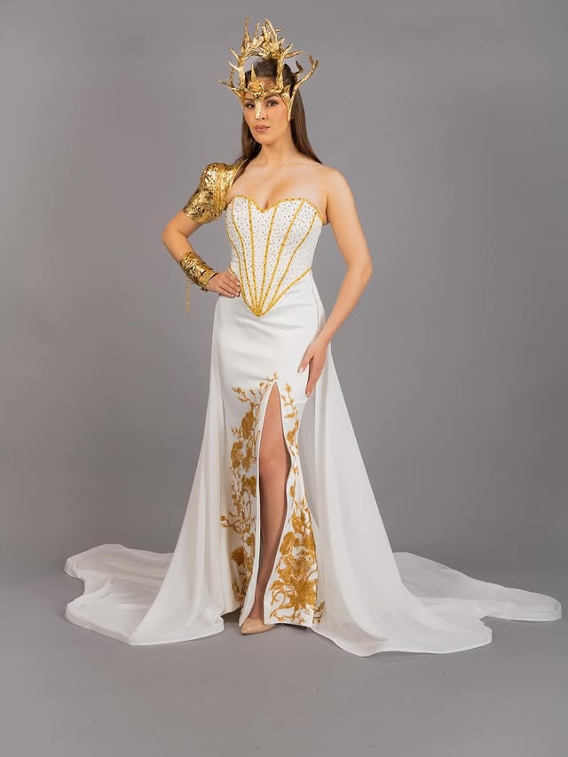 Мисс Финляндия Сара Дзафце в костюме "Богиня живых корней" - символа защиты, мира и вечной силы природы. Её белое платье, вдохновлённое лесным туманом и снежными северными пейзажами, отражает чистоту Финляндии и нашу вечную связь с природой. Золотые, похожие на корни узоры, стекающие по подолу, символизируют силу жизни, а рога, похожие на корону, возвышаются как дань древней мудрости лесов. Золотые наручники воплощают мужество — тихую силу хранителя, который олицетворяет и красоту, и равновесие. Потому что корни — это не только о том, откуда мы пришли, но и о том, как мы растём, какие выборы делаем и какие связи связывают нас друг с другом и с землёй, которую мы защищаем. Мифическая и современная, Богиня Живых Корней напоминает нам, что истинная красота и сила рождаются из глубоких корней.