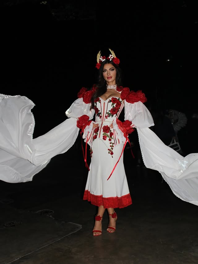 Мисс Молдова Мария Игнат в образе, вдохновлённом молдавской вышитой рубашкой «ie» с богатой красной вышивкой, символизирующей силу, защиту и наследие. Белая основа символизирует чистоту, а 3D-детали ручной работы подчёркивают мастерство, передаваемое из поколения в поколение. Драматичный плащ и красная корона придают современный, царственный оттенок, отдавая дань уважения традициям маленькой молдавской деревни. Этот образ — дань уважения Молдове, культуре, стойкости и вечной красоте ее родины.