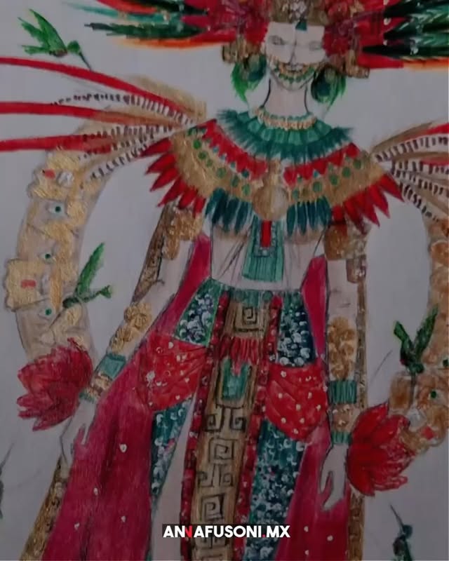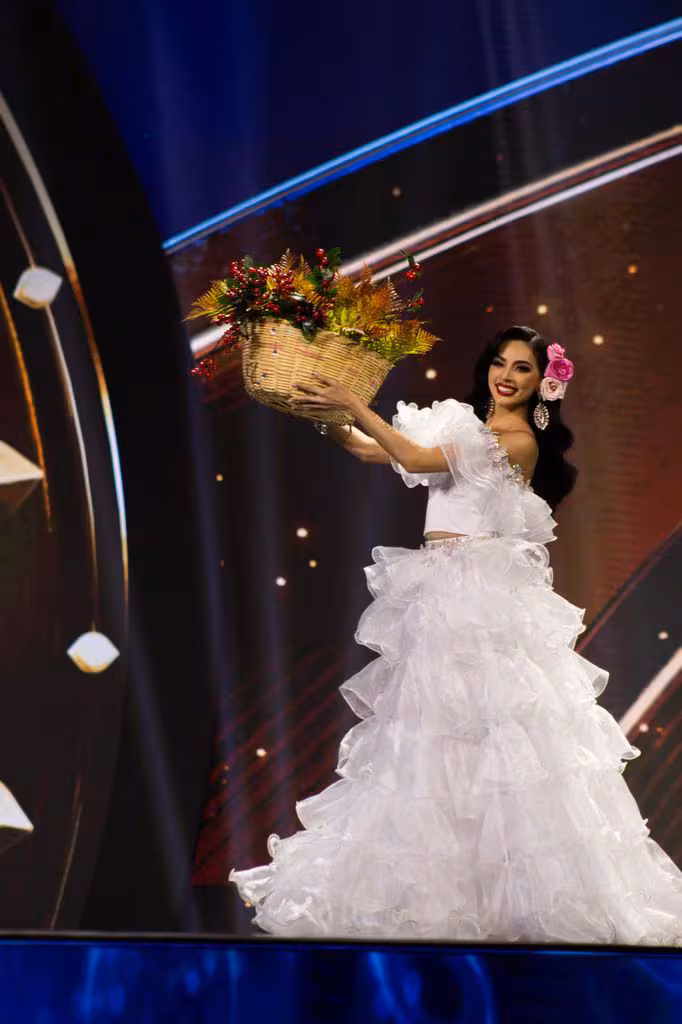 Мисс Мексика Фатима Босх в костюме «Драгоценный цветок», вдохновленным богиней Xochiquétzal - одной из самых красивых и важных божеств пантеона Мексики - богиней любви, плодородия, чувственности, удовольствия, творчество, цветов, молодости и искусства. Костюм рассказывает историю страны, ее силы и вечных корней. Он включает красные розы, связанные с женским началом и ритуалом в мире мексиканцев. Костюм состоит из плюма, топа с наплечниками, юбки и щитков для голень, выполненных в красном, зелёном и синем тонах с золотыми деталями и стразами. Использовались перья, вышивка и украшения, а также фигуры колибри с движением для придания динамичности. В набор также входят символ Ollin и плащ с созвездием Pléyades, — ключевые элементы в мировоззрении Мексика. Разработка заняла около семи месяцев — процесс, требующий тщательного мастерства, структуры, предназначенной для обеспечения мобильности и сочетания традиционных техник с современными ресурсами. Дизайнер Fernando Ortiz отметил, что разработка костюма требовала исторических исследований и тщательного изучения мексиканской иконографии, чтобы создать визуально цельную работу. Для Фатимы носить это творение было «как нести часть души Мексики», способом поделиться идентичностью и корнями на международной арене. Эффект - ожесточенный роман с драматическим расцветом.