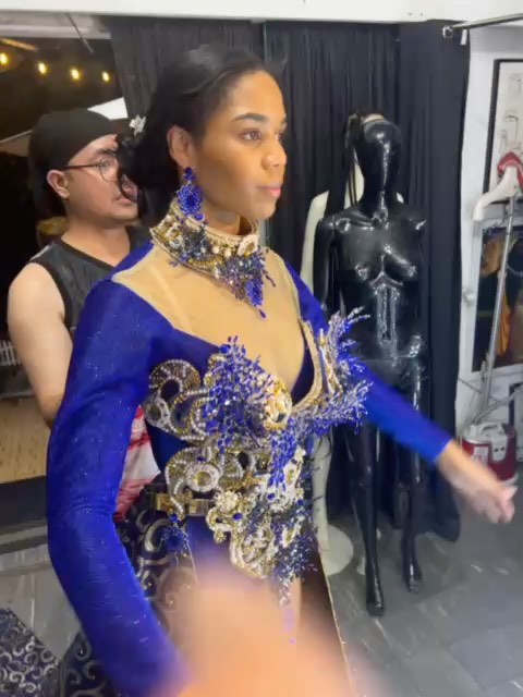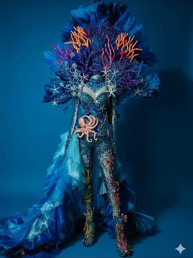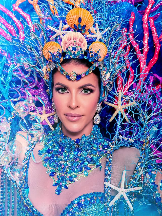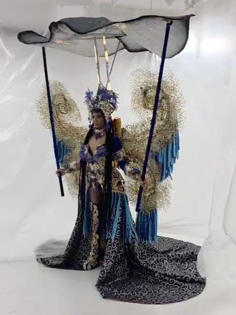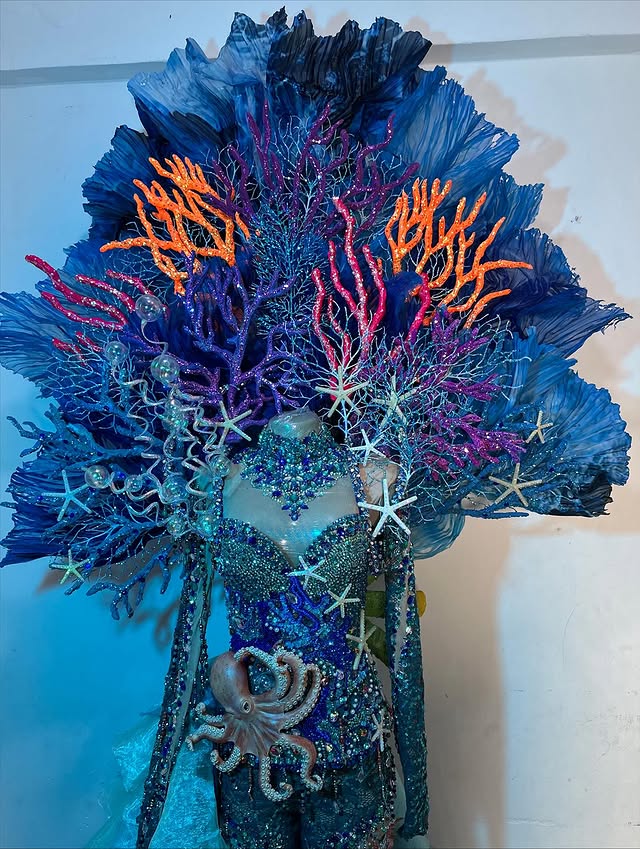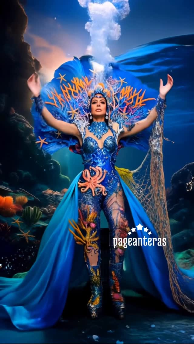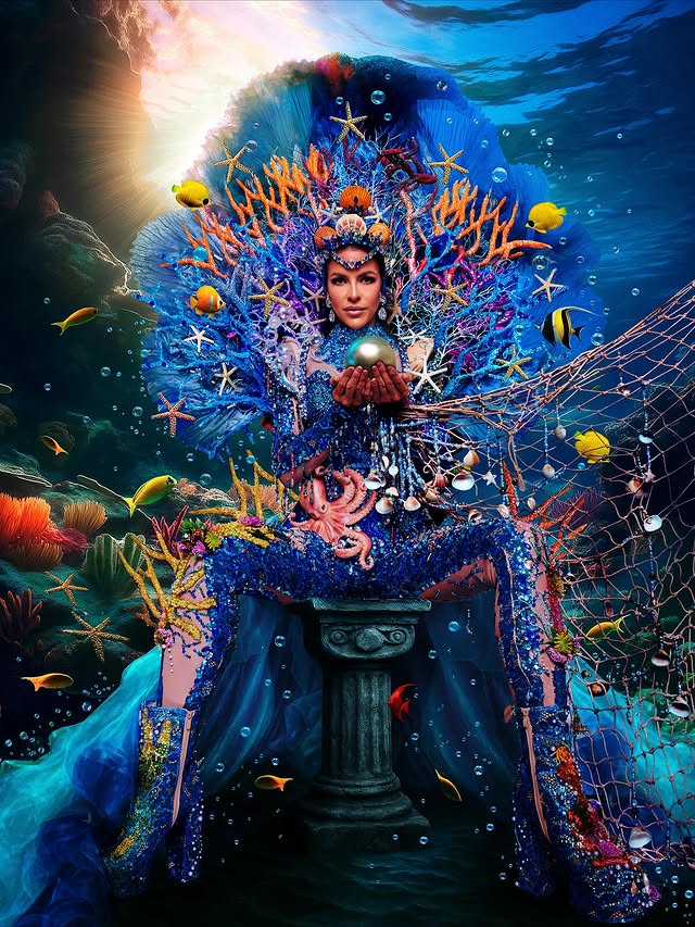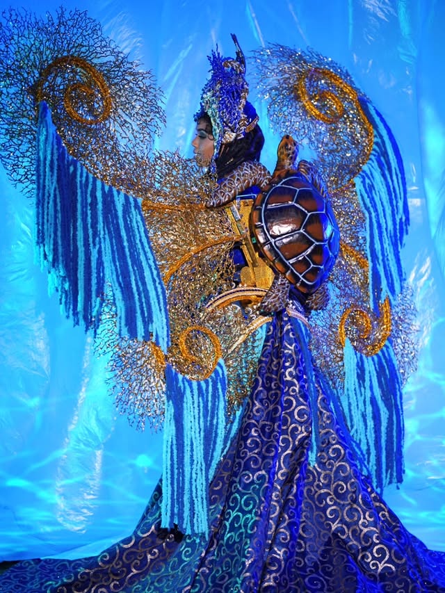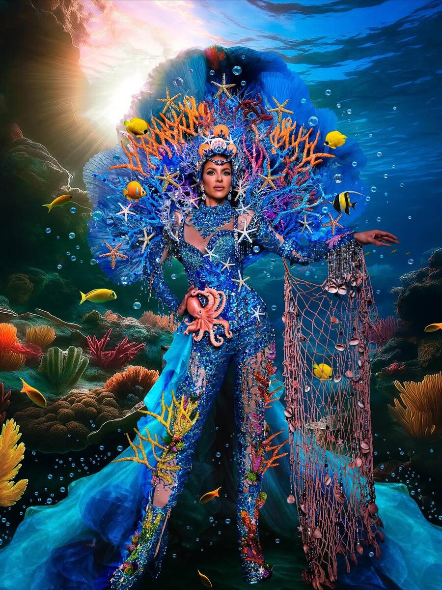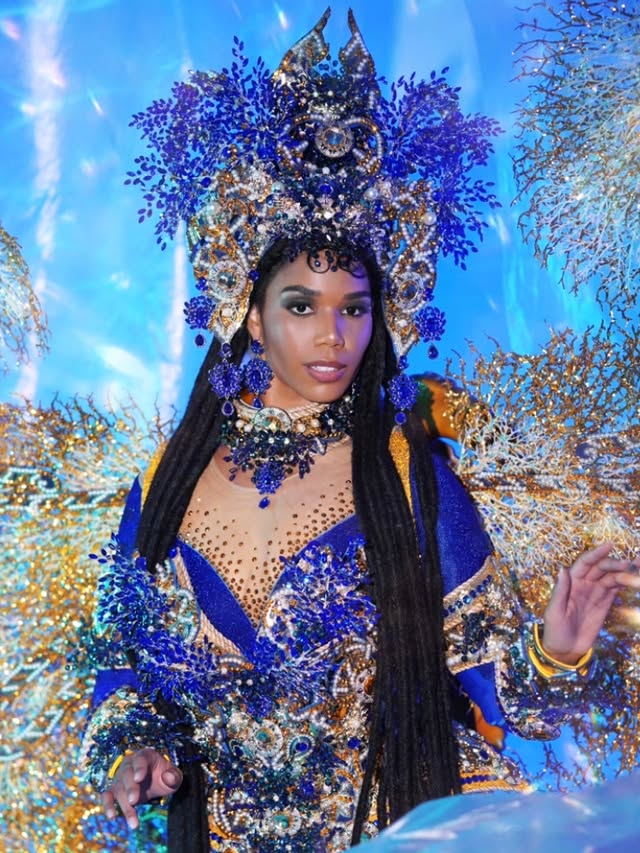 Мисс Каймановы острова (Таити) Муреи Сеймур в костюме "Yemaya — Божество океана", вдохновленным афро-карибским водным духом Yemaya, орише из религии йоруба, которая считается матерью океана. По словам Сеймур она хотела, чтобы ее костюм был «призывом заботиться о коралловых рифах». Кристально чистая голубая одежда, как мерцание солнечного света на открытой воде, каждое движение как дыхание океана. Золотая филигранность лифа и сапог отражает красоту жизни под волнами — чешуйки, ракушки и течения. На спине лучистые коралловые и морские веерные крылья поднимались, как живые рифы: ветвящиеся, украшенные драгоценностями и мощные. Они чтят экосистемы, которые кормят семьи, защищают берега и определяют идентичность карибских людей. В основе этого видения лежит Yemaya, афро-карибская мать моря, переплетенная с фольклором Каймановых островов, напоминание о том, что океан не только защитник, но и поставщик еды. Небесный скат венчает историю - символ тайны, мудрости и удивления под водой. Для кайманцев коралловые рифы не являются декорациями — они являются выживанием. Это – продовольственная безопасность. Это культура. Это дом. Дизайнер Patrick Isorena оживил душу островов с артистизмом, уважением и блеском. 22-летняя Сеймур имеет степень в области политики и международных отношений и строит карьеру в актерском мастерстве и модельном бизнесе.