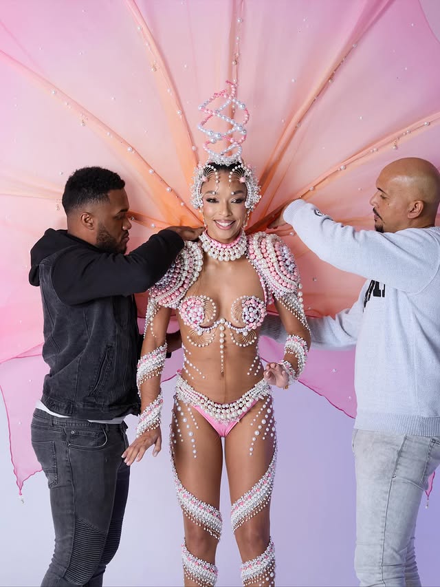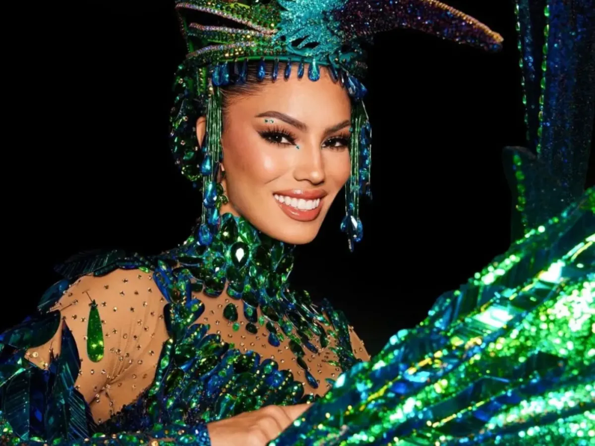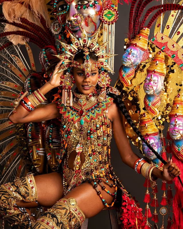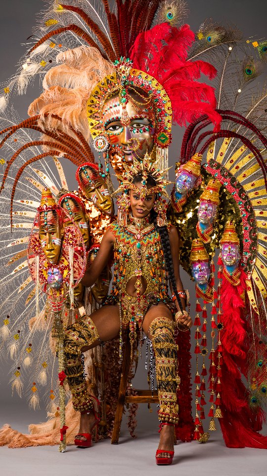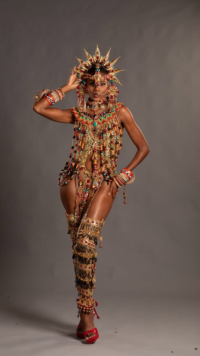 Мисс Тринидад и Тобаго Латифа Моррис была одета в яркий наряд «Происхождение Дугласа» - где Ганги встречаются с Нилом, вдохновленный стилем ее предков. Моррис рассказала, что этот карнавальный наряд был вдохновлен ее африканской бабушкой по материнской линии и ее восточно-индийской бабушкой по отцовской линии. Разработанный Шейном Джеймсом, он сплетает воедино священное бисероплетение Ганга, символизирующее духовность и наследие со смелыми африканскими принтами, сияющими перьями и металлическими акцентами. Величественный головной убор поднимается, как солнце, где встречаются две реки; украшенный символами богатства, мудрости и плодородия, взятыми из обоих наследий. Моррис — 32-летняя основательница движения BBL Movement, которое означает «Строим лучшую жизнь». Оно помогает молодым людям вести здоровый образ жизни и строить многообещающее будущее.