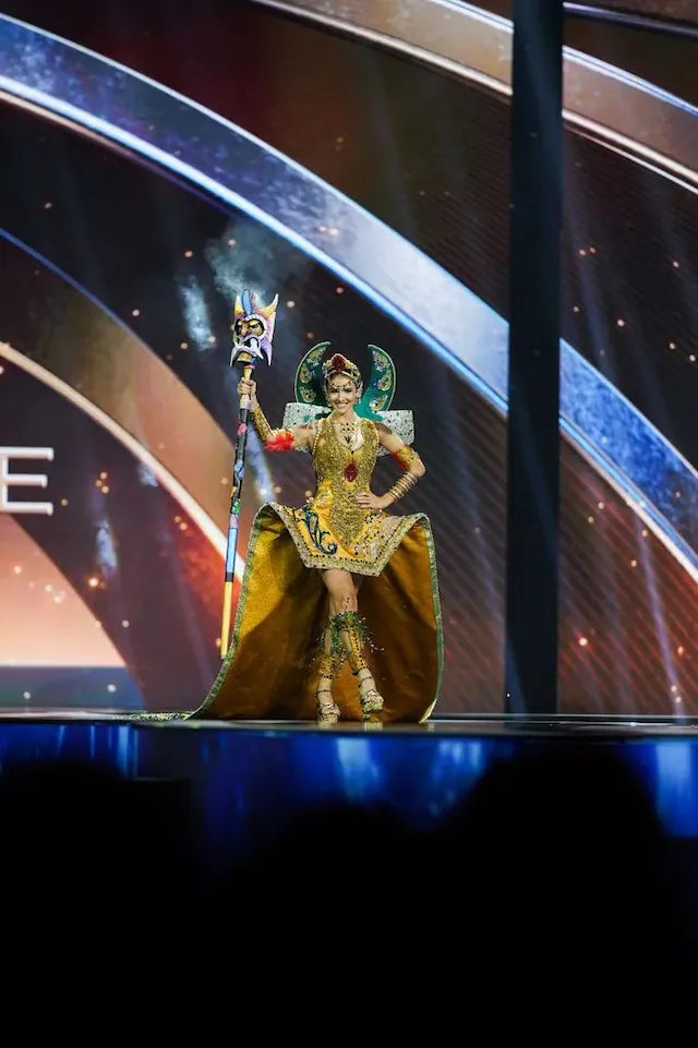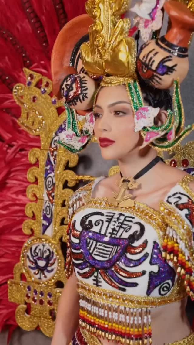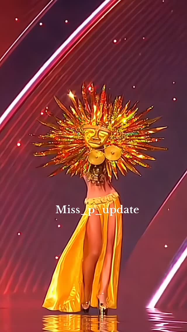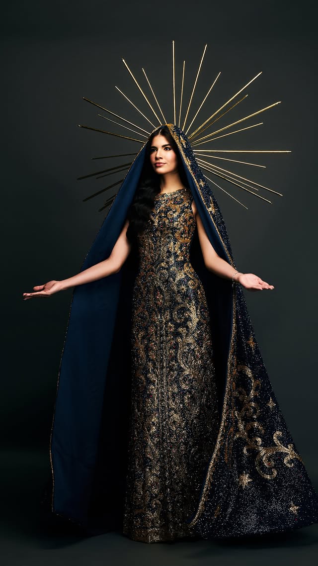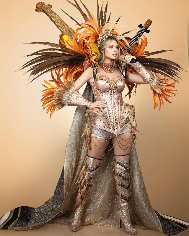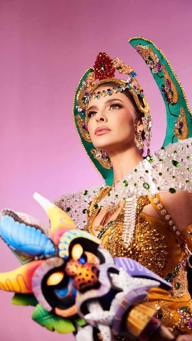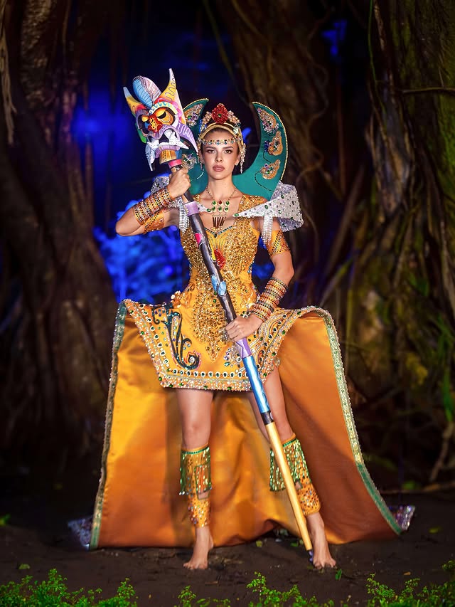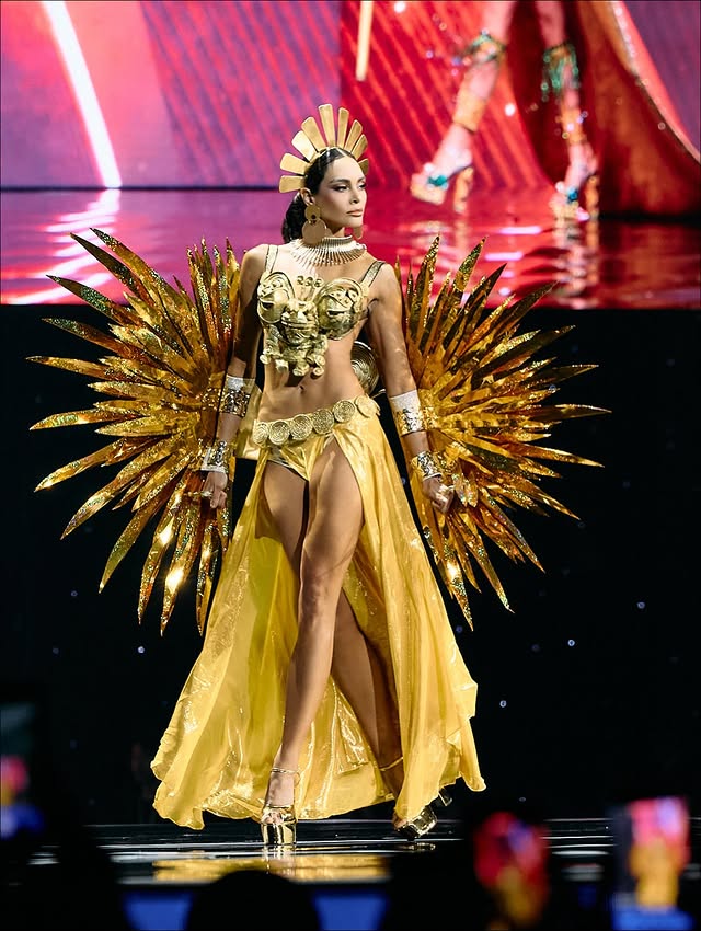 Мисс Колумбия Ванесса Пульгарин в расплавленном золоте. Костюм черпал вдохновение из доколумбового искусства, которое является изобразительным искусством коренных народов Карибского бассейна, Северной Америки, Центральной Америки и Южной Америки. ​Костюм имеет скульптурные золотые элементы, образующие нагрудный знак из стилизованных лиц и символов. Юбка из мерцающей золотой ткани, которая движется, как солнечный свет. На руках зубчатые, мерцающие шипы, напоминающие сияющие солнечные лучи. Головной убор имеет восходящие золотые пластины, которые выгладят как лучи солнца на церемониальной короне. Она выглядит как живая реликвия, свирепая, элегантная и светящаяся силой предков.