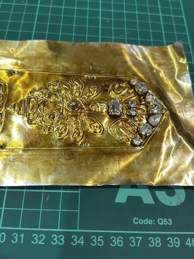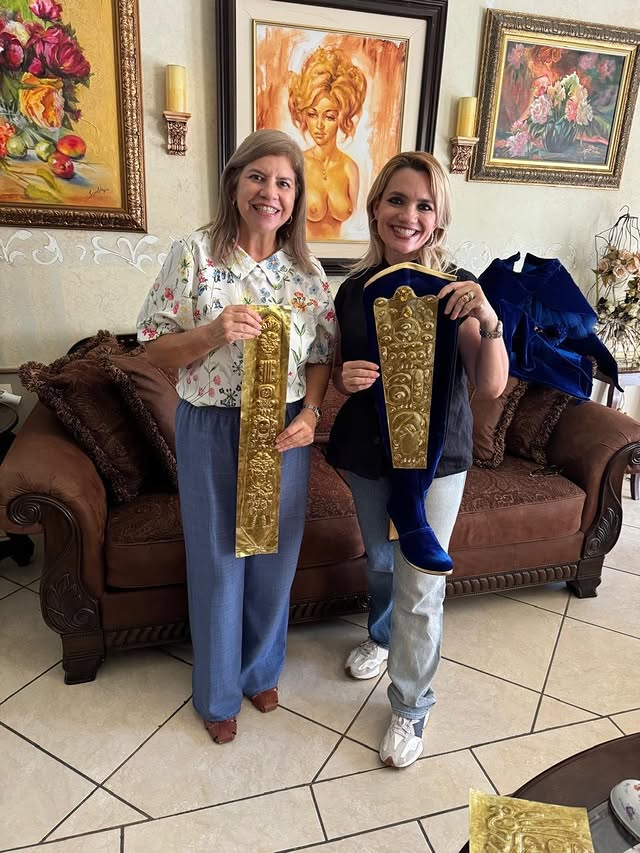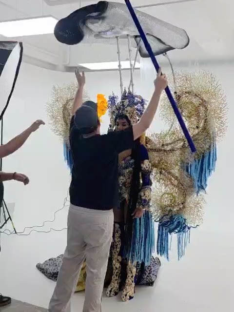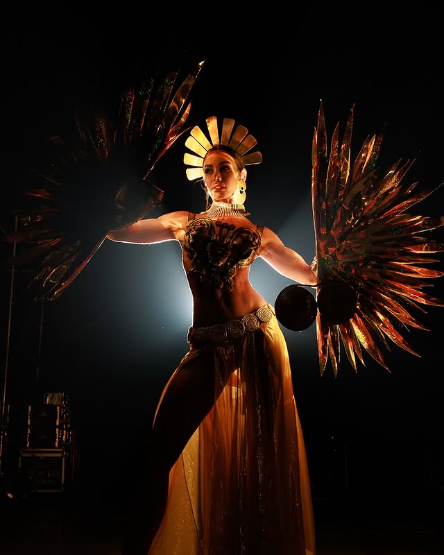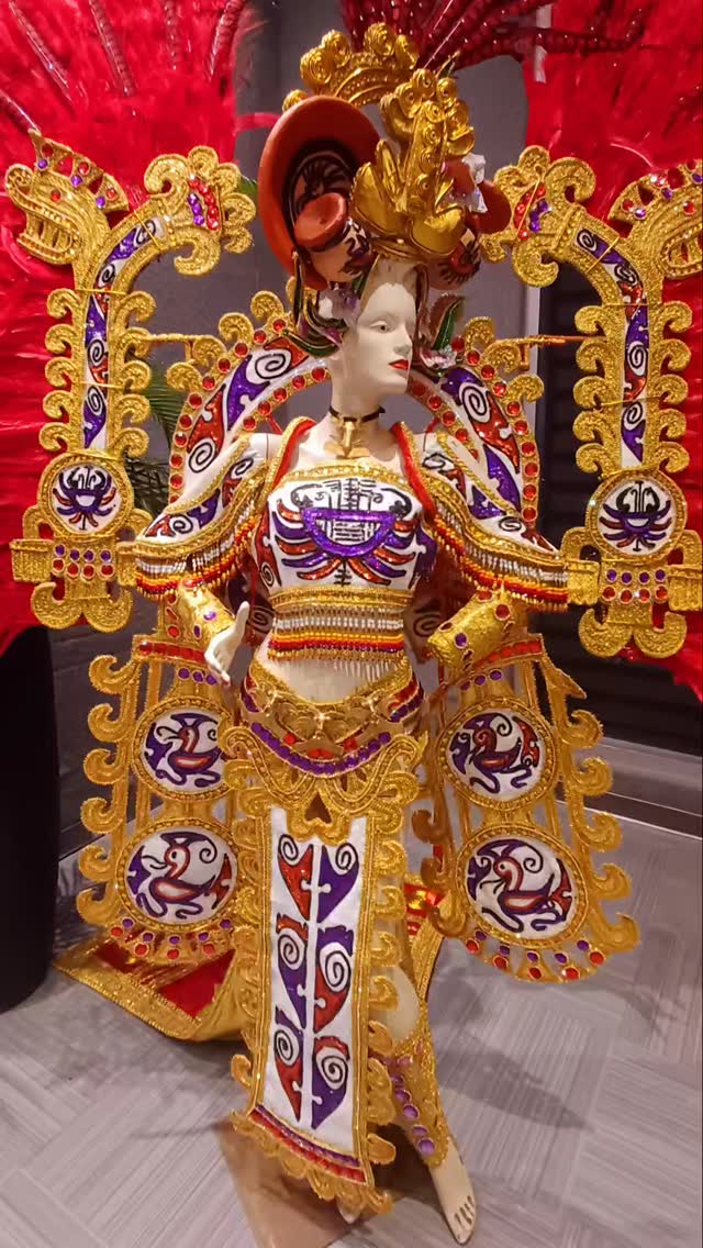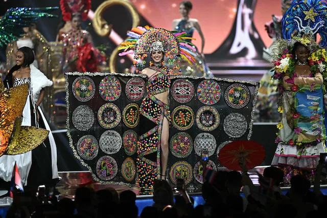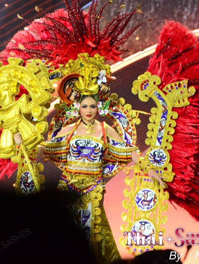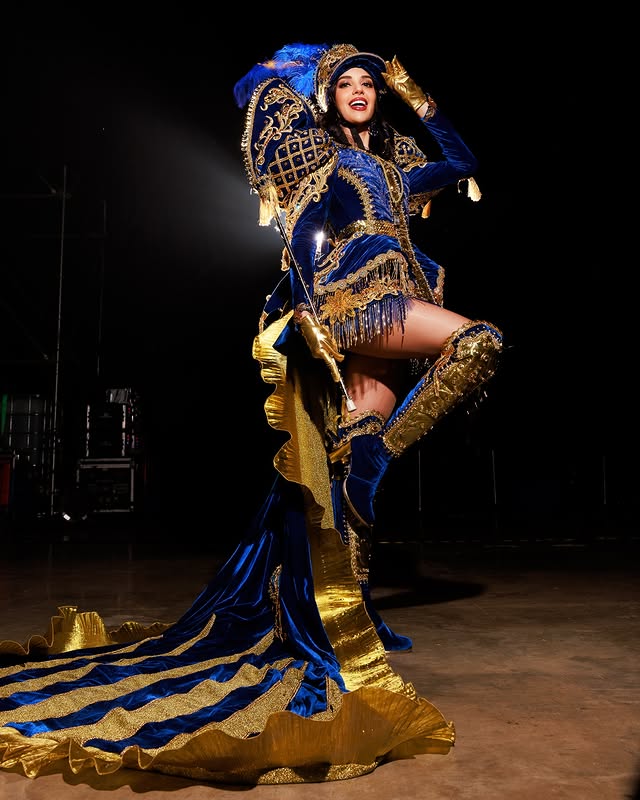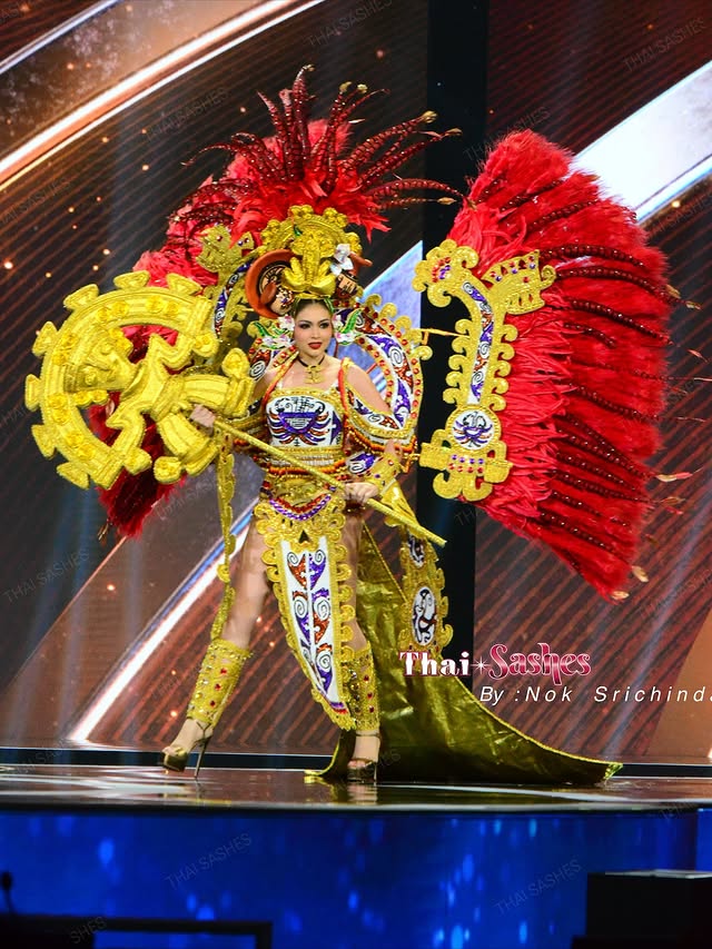 Мисс Колумбия Ванесса Пульгарин в расплавленном золоте. Костюм черпал вдохновение из доколумбового искусства, которое является изобразительным искусством коренных народов Карибского бассейна, Северной Америки, Центральной Америки и Южной Америки. ​Костюм имеет скульптурные золотые элементы, образующие нагрудный знак из стилизованных лиц и символов. Юбка из мерцающей золотой ткани, которая движется, как солнечный свет. На руках зубчатые, мерцающие шипы, напоминающие сияющие солнечные лучи. Головной убор имеет восходящие золотые пластины, которые выгладят как лучи солнца на церемониальной короне. Она выглядит как живая реликвия, свирепая, элегантная и светящаяся силой предков.