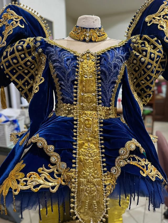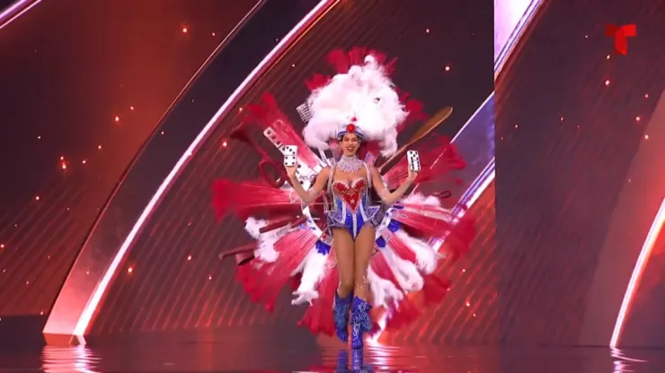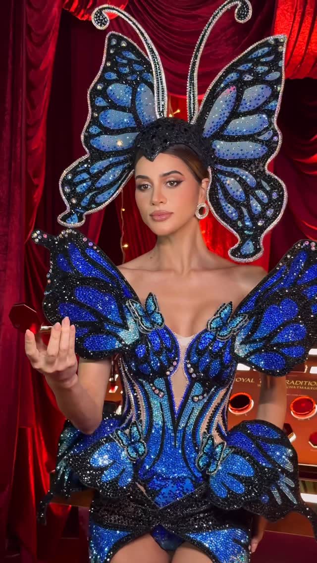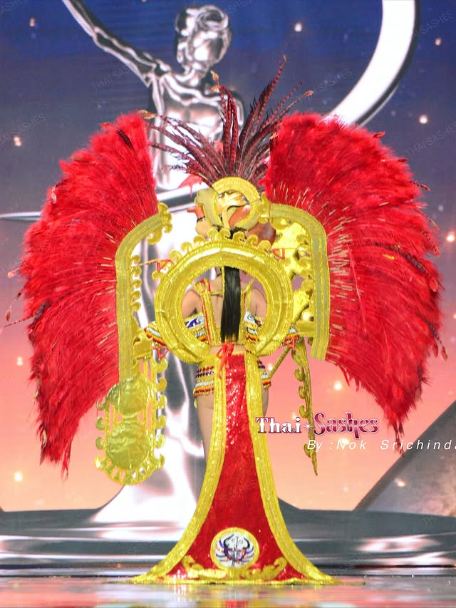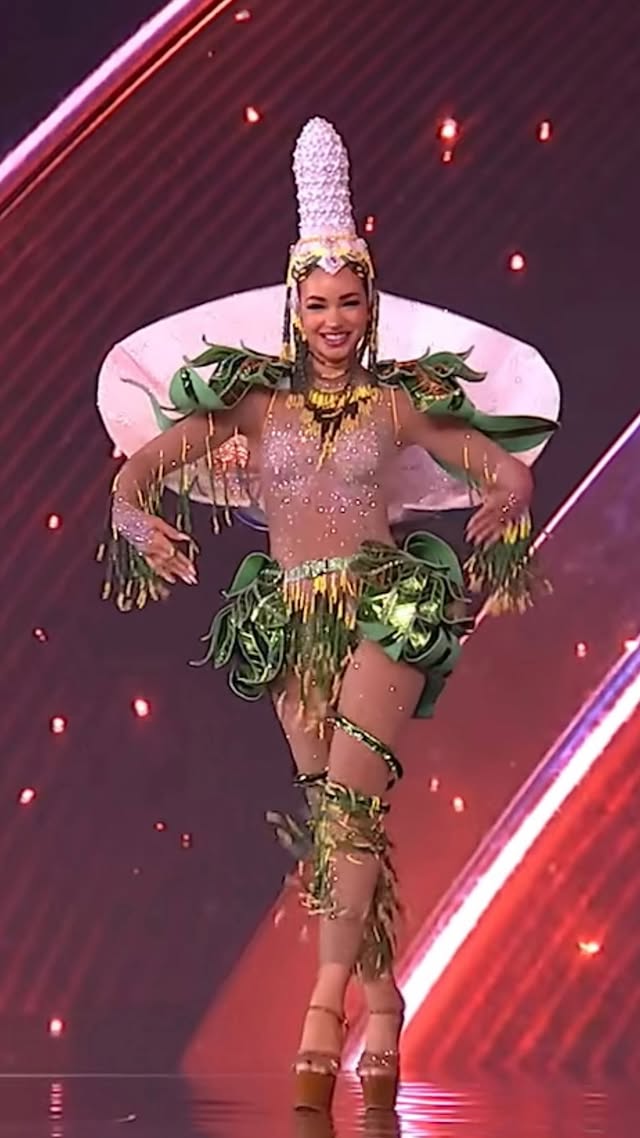 Мисс Панама Мирна Кабальини Буше показала историческую драму, выйдя в костюме «El Cabto Áureo del Gran Cacique». Взгляд приковал сложный головной убор, наполненный розами и богато украшенными формами, а ее руки обрамляли смелые фигуры, которые напоминали золотые щиты. "Золотой шлем великого вождя: эхо золота и власти предков. Это величественный и ослепительный портал в золотой век доколумбовой Панамы. Произведение является мощным восхвалением великолепия, богатства и сложного мировоззрения высоких иерархий перешейка, отдавая дань уважения легендарным культурам Гран-Кокле и Верагуаса. Насыщенный блеском элиты, он передает священное значение золота, найденного в церемониальных местах, где были похоронены лидеры с непревзойденными почестями, которые отмечали их божественный и земной статус. Платье включает в себя полихромные узоры и геометрические рисунки, воспроизводящие детальное искусство ритуальных сосудов и саркофагов. Обрамленный красным цветом, который представляет собой представление крови, жизненного принципа и силы существования. Сопровождают дизайн деликатные аксессуары, объединяющие историю, археологию и величество. «Золотой шлем великого вождя» - это доспехи истории и света, предковый крик Панамы, который звучат силой своего золота, ее обрядов и ее величайших лидеров" - написано в пресс-релизе дизайнера и участницы.
