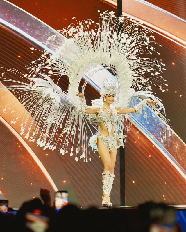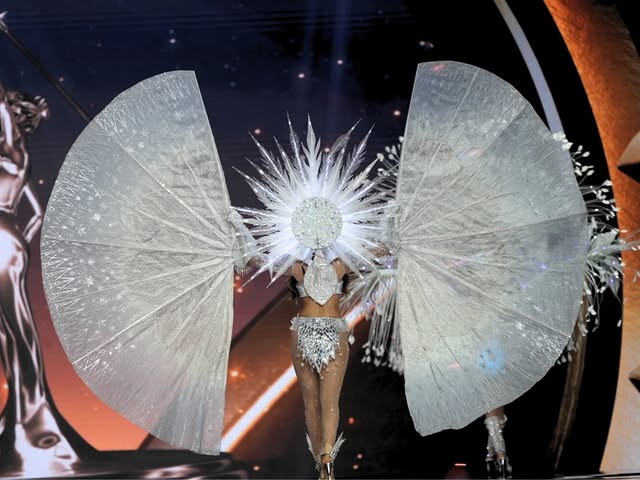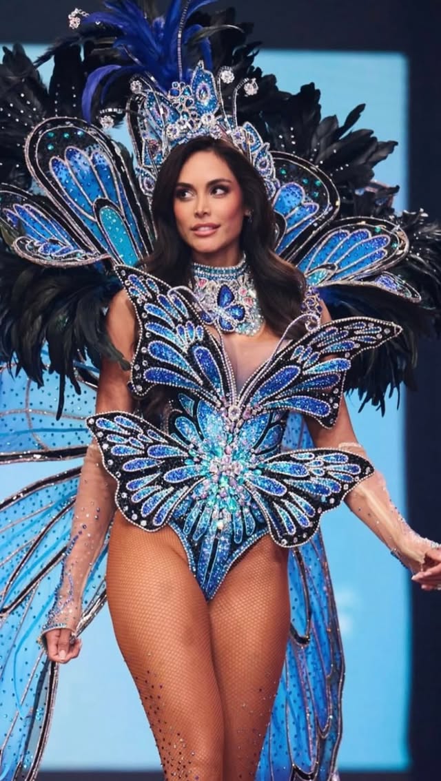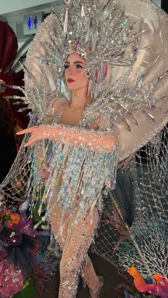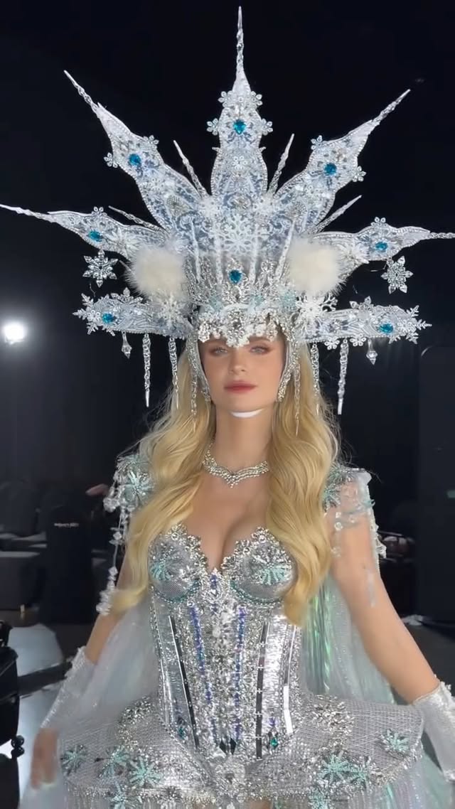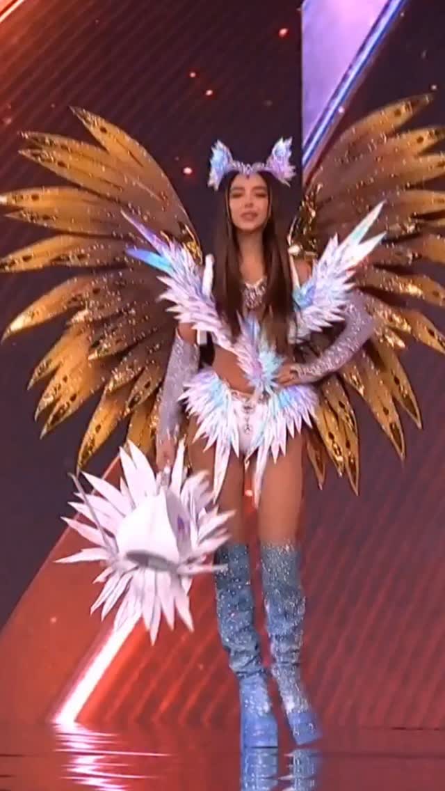 Мисс Перу Карла Бачигалупо. Наряд вдохновлён самой высокой точкой Перу. El Huascarán — это не просто гора. Es un Apu: священный дух Анд. Она не только передаёт вид на гору, но и отражает суть Es un Apu. Серебряный ансамбль из двух частей, сверкал стразами и светом. Огромные крылья, похожие на веер, украшены снежинками, светящимися под сценическим светом. Её головной убор поднимался резкими серебристыми пиками, напоминающими замёрзшие солнечные лучи. Карла сверкала как снежная королева во время трансформации.