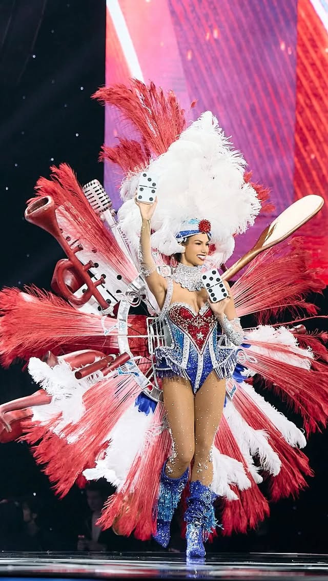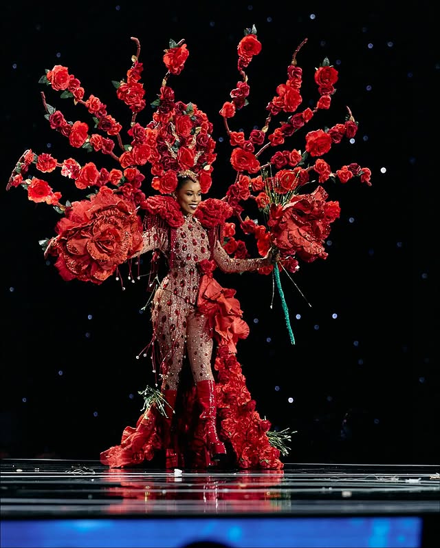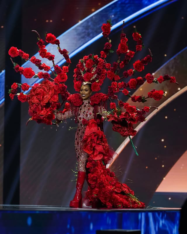Мисс Доминиканская Республика Дженнифер Росио Вентура Марте в костюме "La Flor de Bayahhibe" - это кактус с розовыми цветами, который растет только в Доминиканской Республике. Уникальная красота, которая цветет только на Доминиканской земле и сегодня вдохновила костюм, который чтит корни республики. Каждый цвет казался праздничным, и каждая деталь, казалось, шептала истории о традициях, народном искусстве и местных торжествах. Королева красоты была одета в блестящий боди, покрытый розовыми, голубыми и фиолетовыми блестками. Но именно ее наряд на спине — ярко-розовый расцветающий цветок — стал главной изюминкой шоу наряду с ее пернатым розово-голубым головным убором. По словам Мисс Вселенной, розовый оттенок цветка символизирует «нежность, надежду и красоту — качества, которые воплощают жизнерадостный дух ее нации». 27-летняя Вентура — инженер-строитель и генеральный директор собственной строительной компании.