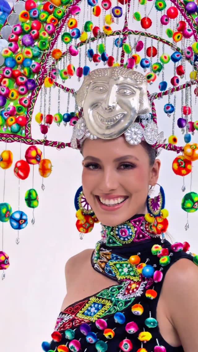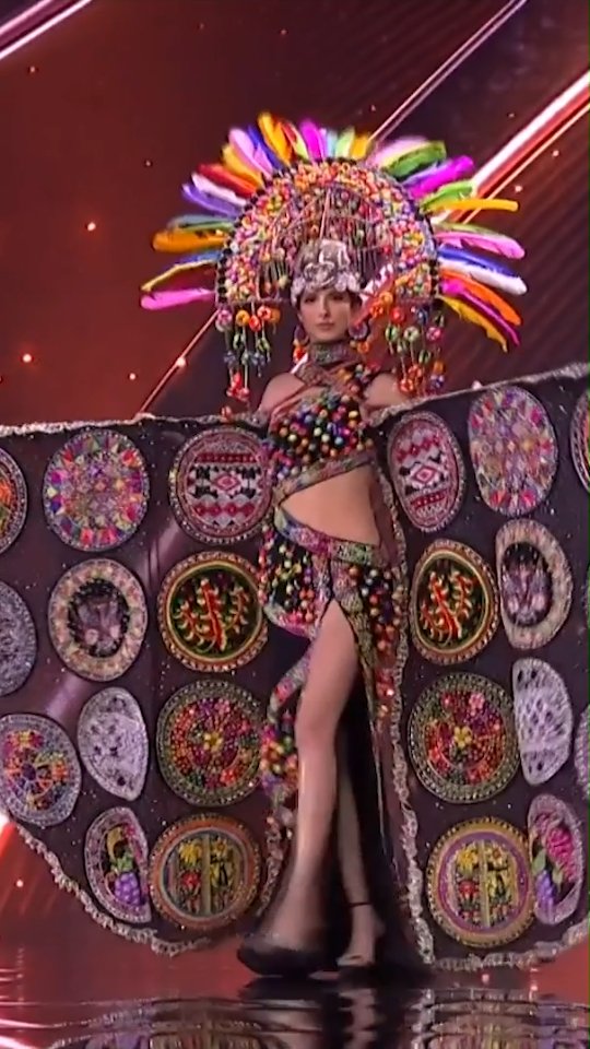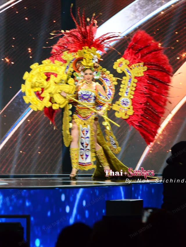 Мисс Боливия Ессика Хаузерманн вышла в мощном костюме, который является огромной данью уважения текстильным ремесленникам Боливии в его двухсотлетию. Mama Ocllo, богиня инков, которая, согласно легенде, вышла из священных вод озера Титикака, на боливийском острове Солнца, возрождается в этом дизайне, чтобы показать миру величие боливийского текстильного искусства. В нем переплетены три экорегиона страны: Альтиплано, Сьерра и Сельва, объединенные в единую историю ручной работы. Женская сила отражается в каждом стежке. Костюм прославляет знания предков через круги, представляющие космос, вселенную и саму суть жизни, все вручную вышито цветными нитями и тысячами кристаллов, которые улавливают свет, как если бы они были звездами. Платье покрыто тысячами мини-шерстных помпонов, сделанных один за другим вручную, что символизирует многоэтничность и разнообразие народов Боливии. Каждый помпон - это голос, сообщество, история, которая отказывается исчезнуть. Дизайн Sonia Avilés живая ода божественности женщин Солнца и бесконечному наследию боливийского текстильного искусства.