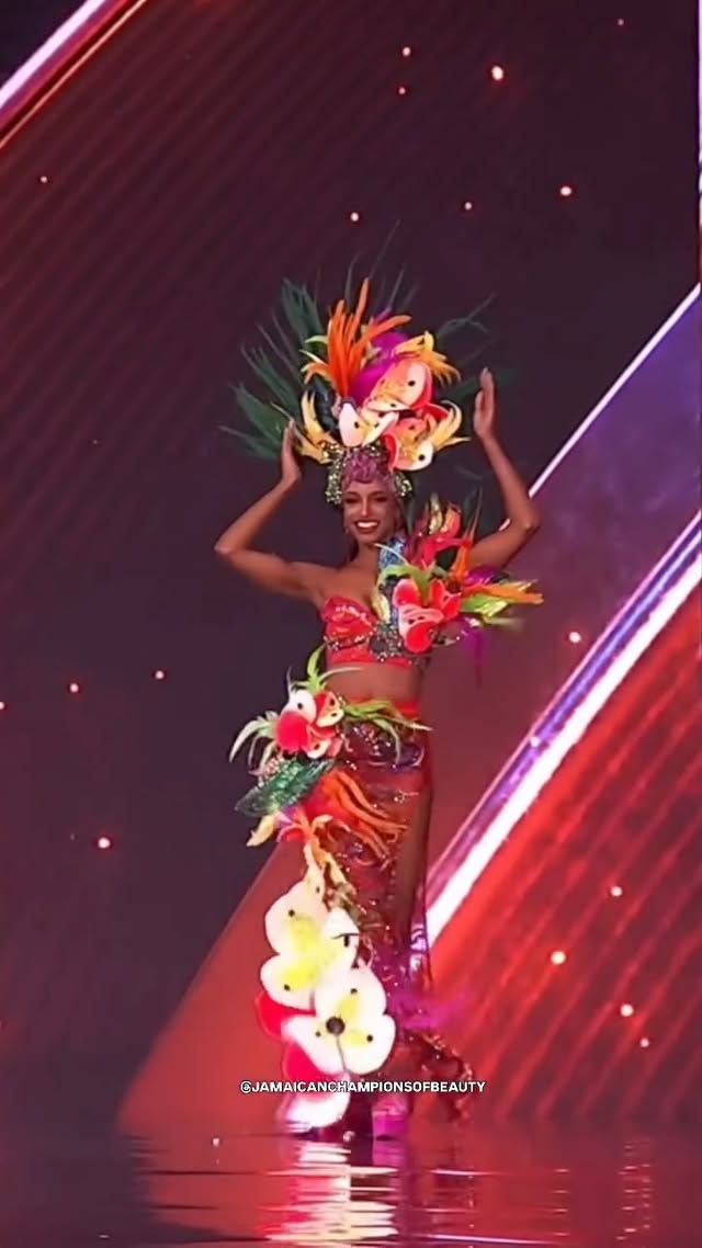 Мисс Ямайка Габриэль Генри выглядела абсолютно царственно в костюме, отдавая дань уважения знаменитому рынку продуктов Линстед в приходе Сент-Кэтрин (Ямайка). На Ямайке рынки являются довольно культурным явлением, с взрывом цветов, текстур и реальных драм. Рынок стал легендарным из-за продажи плодов дерева Ackee (Blighia sapida) — также известное как аки или блигия вкусная. Этот национальный костюм, разработанный Atelier Dermoth Williams, демонстрирует энергию рынка Линстед и плодов аки. Он имеет бюстье на одно плечо с обилием аки и других красочных украшений на левом плече, которое асимметрично переносятся на правую сторону юбки с бисером, блестками и другими украшениями, продолжающими яркую красочную атмосферу рыночной сцены. Внешний вид заканчивается головным веером из традиционной ткани Ямайки и головным убором, прославляющим национальные фрукты Ямайки на фоне яркой атмосферы рынка Линстед.