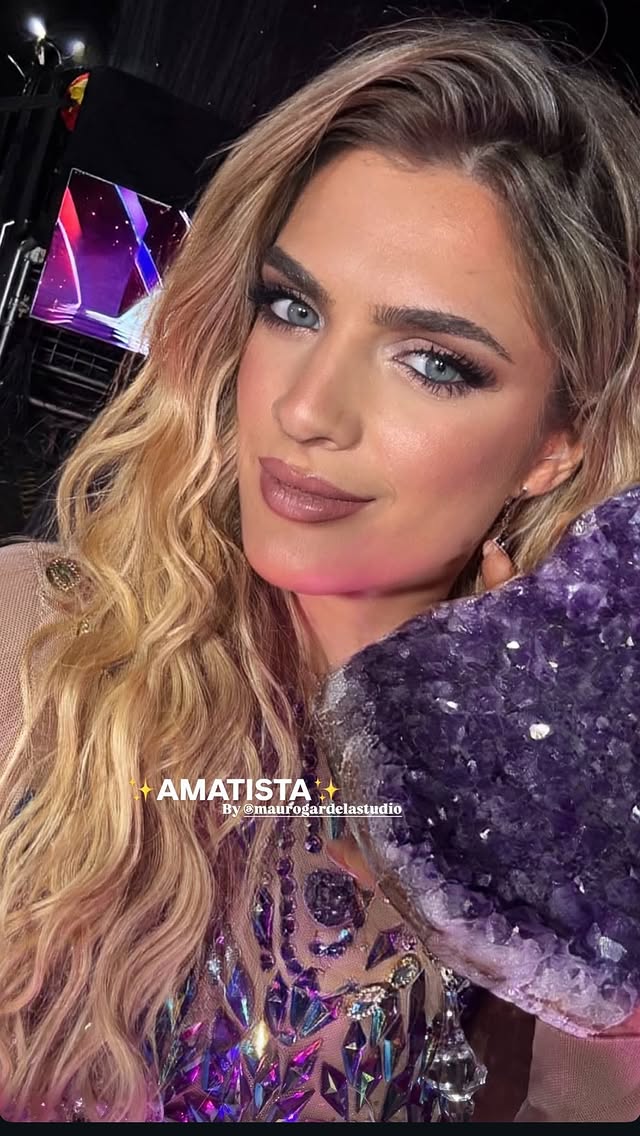 Мисс Уругвай Валерия Баладан в костюме, вдохновленным драгоценными аметистами северного Уругвая, платье украшено кристаллами и стеклом.