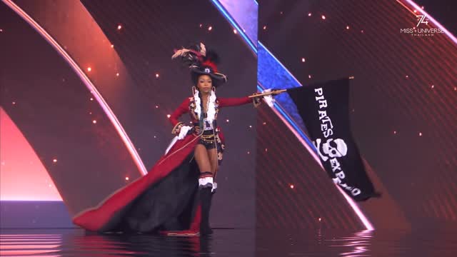 Мисс Багамы Маликэ Маранда Боу. Костюм посвящен концу пиратства: авангардная дань уважения определяющей главе в истории Багамских островов. Этот костюм посвящен не самим пиратам, а победе над ними и стойкости нации. Видение национального костюма было задумано и разработано национальным директором Anthony Smith, а сшит и украшен местным дизайнером Тэмми Арлингтон, которая воплотила видение в жизнь.