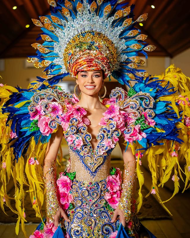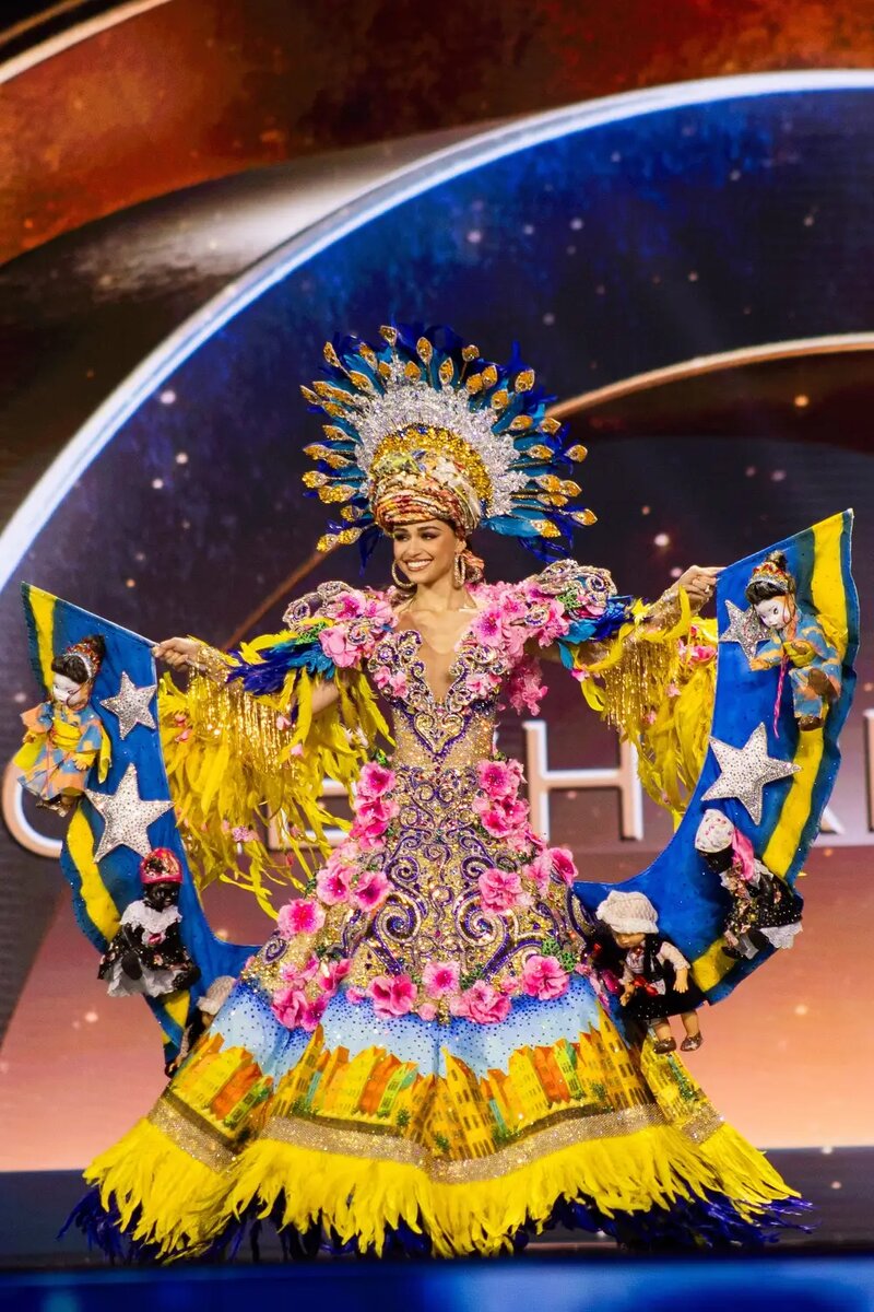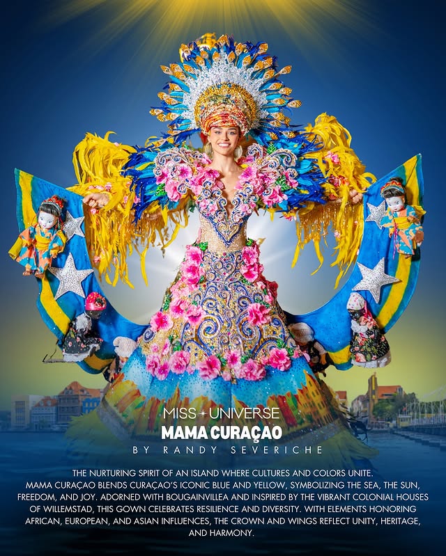 Мисс Кюрасао Камилла Томас в костюме "Мама Кюрасао" показала материнский дух острова, который охватывает всех, кто прибывает на его берега. Ее платье рассказывает историю земли, где культуры, цвета и мечты объединяются под карибским солнцем. Синий и желтый символизируют море и солнце, символы свободы, тепла и радости. Ее платье украшают цветы Bougainvillea, традиционные цветы Кюрасао - яркие и устойчивые, цветущие под ярким солнцем острова, как и ее люди. Вокруг юбки стоят красочные колониальные дома Виллемстада, объекта Всемирного наследия ЮНЕСКО, каждый из которых окрашен в яркие оттенки, которые отражают единство через разнообразие, где каждый цвет и каждая культура находят свое место. Она несла флаг Кюрасао, и на нем куклы представляющие нации, которые помогли сформировать остров; Африку, чей ритм бьется в его сердце; Европу, чей артистизм построил его основы; и Азию, чья мудрость и торговля обогатили его душу. Ее головной убор, вдохновленный традиционным ангочи, превращает кюрасаонский головной убор в корону гордости и наследия, почитая женщин, которые несли достоинство через поколения. Ее крылья простираются, как волны океана, волны, которые не делятся, а объединяются. Мама Кюрасао больше, чем мать своего острова, она является живым символом мира. На этой маленькой скале в Карибском бассейне люди многих национальностей и вероисповеданий живут вместе в гармонии. Она мать Карибского моря, хранительница гармонии, любви и внутреннего мира, напоминая, что сила нации и самого мира заключается в силе единого сердца. 26-летняя Томас окончила военную академию в Северной Каролине, после чего вернулась на Кюрасао, чтобы стать совладелицей ресторана и помогать в управлении семейной фермой.