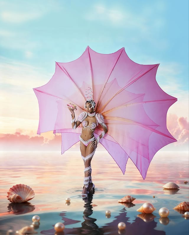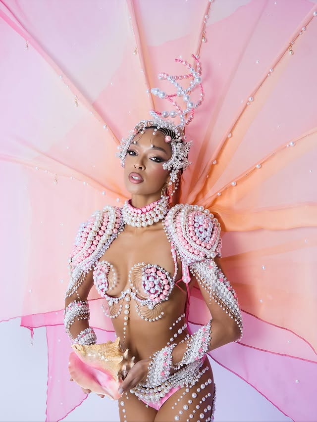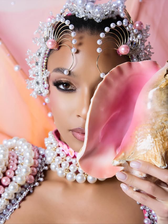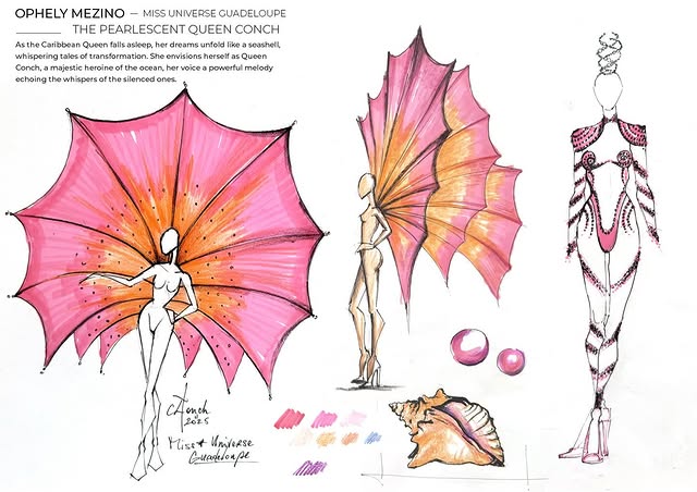 Мисс Гваделупа Офелия Мезино в костюме "Прелестная Queen Conch" - величественая героиня океана,  а ее голос - мощная мелодия, перекликающаяся с шепотом моря. Когда карибская королева засыпает, ее мечты раскрываются, как ракушка, шепчущая сказки о перевоплощении. Розовая жемчужина из ламби несет в себе память и душу Карибского бассейна - это культурный символа Гваделупы, воплощая его, Мисс прославляет наследие и символизирует светлую Женщину, которая одновременно нежна и могущественна, посланник мира и стойкости. Носить эту жемчужину - значит нести историю архипелага: гордая, решительная и яркая Гваделупа, остров с полупрозрачными водами, укоренившейся культурой и сердцем, открытым миру. Мезино вышла в прозрачном боди, покрытом жемчугом, который также украшал ее плечи и спускался по ногам. Она дополнила наряд ярко-розовым аксессуаром на спине, стилизованным под верхнюю часть раковины. 26-летняя Мезино — модель и актриса, снявшаяся в сериале «Люпен».