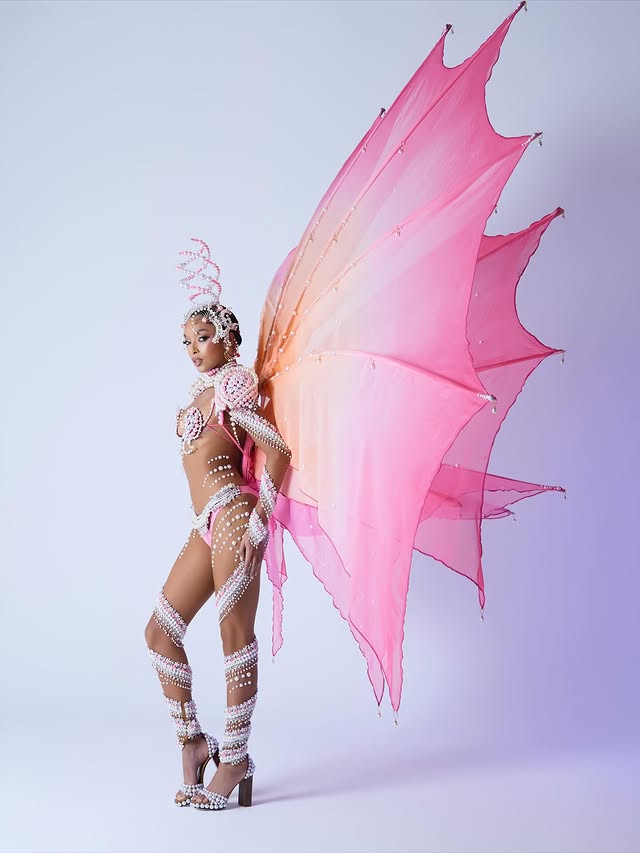 Мисс Сант-Лючия Шианн Смит в костюме живого духа фестиваля La Rose - шедевра превратившего традицию в высокий кутюр. Костюм из возвышающихся алых роз ручной работы, где каждый лепесток символизирует страсть, стойкость и непреходящую гордость общества Ла-Роуз. Облегающий силуэт блестит, как утренняя роса на лепестках роз, захватывая элегантность и благородство королевского двора фестиваля. На талии каскад драматических розовых кустов, пышных и объемных, перекликающийся с изобилием и артистизмом торжества. Негабаритный розовый головной убор венчает образ фестивальной королевы. Каждый цветок, каждый кристалл и каждая линия этого дизайна отдают дань культурному наследию.