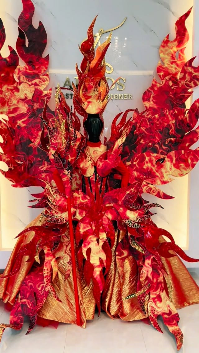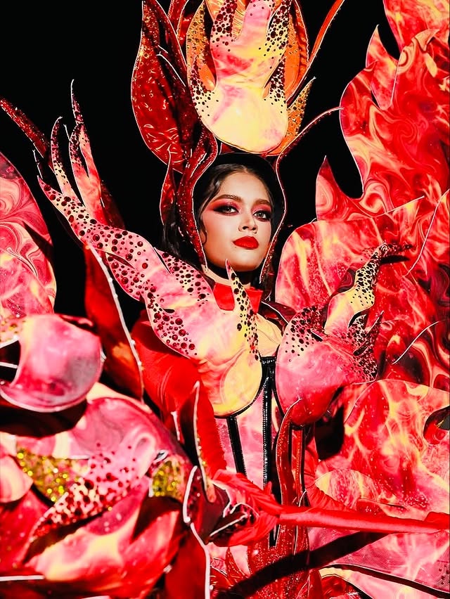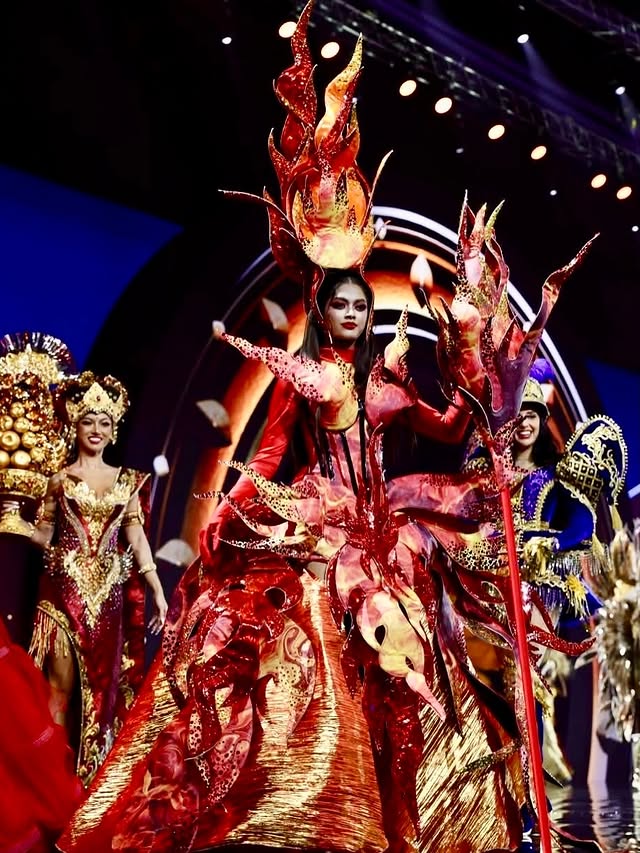 Мисс Гайана Чандини Балджор в костюме «Пламя скрытых духов — старое возрождение», вдохновленным одной из самых знаковых фольклорных фигур Гайаны "Old Higue". Укорененный в гайанском фольклоре, Старый Хиг (или Fyah Rass) - это таинственная, огненная старуха, которая ночью сбрасывает кожу, чтобы бродить как шар пламени, истощая энергию живых. Но этот костюм переосмысливает ее историю как историю расширения прав и возможностей, трансформации и мистической красоты, представляющей огонь Гайаны, стойкость и дух предков. Вместо того, чтобы изображать ее злом, мисс Гайана воплощает ее как хранительницу древнего огня, символизируя внутреннюю силу гайанских женщин и неутолимую искру карибской души. Она была одета в бальное платье с юбкой, напоминающей огонь, а мотивы пламени также украшали одно из ее плеч. Этот национальный костюм переосмысливает легенду через призму женской силы, трансформации и пламя предков. Вместо страшного «сбрасывающего кожу» существа старых сказок, мисс Гайана появилась как Возрожденный Дух: хранитель пламени, хранитель древней мудрости и символ непреходящей стойкости Гайаны. Этот костюм представляет собой историю, передающуюся из поколения к поколению: огонь мужества, огонь женщин и огонь нации. Это Возрожденный Old Higue: вечный огонь Гайаны. Примечание: Из-за непредвиденных проблем за кулисами мисс Гайана, к сожалению, не смогла показать полный костюм, в котором была крылатая накидка. 23-летняя Бальджор изучает медицину и хирургию наряду с общественным здравоохранением.