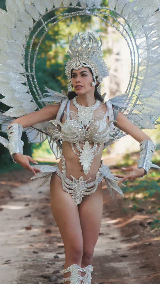 Мисс Парагвай Янина Гомес. Костюм отдаёт дань священному светлячку культуры народов гуарани -  символу надежды, руководства и света во тьме. Вдохновлённый эфирным полётом и зачарованным светом этих духовных существ, дизайн вызывает ассоциации с магией духа, освещающего пути и несущего послания любви и защиты. Изготовленный вручную, костюм покрыт изысканной вышивкой стразами, бусинами и кристаллическими камнями разных размеров, создавая динамические рельефные эффекты, напоминающие светящиеся крылья светлячков. Эти декоративные элементы размещены в выразительных формах на головном уборе, наплечниках, бедрах и ногах, подчёркивая изящные движения и грацию этих световых существ. Внушительная спинка обрамляет силуэт нескольких светлячков, летящих на горе, словно небесные посланники, приносящие своё сияние человечеству. Интегрируя инновационные технологии освещения, костюмы включают стратегически расположенные огни, имитирующие гипнотическое мерцание естественного света, создавая впечатляющее визуальное зрелище, сочетающее традиции, духовность и современность. Каждая деталь отражает богатое культурное наследие народов гуарани и глубокую связь с природой, подчёркивая светлячка как духовного наставника, вселяющего надежду и защиту. Исключительное ремесленное качество её реализации подчёркивает преданность и мастерство, которые сливаются в этой работе, отражая символическую красоту светлячка и его способность освещать путь в моменты темноты. Общий эффект — мерцающая серебристая небесная фантазия, излучающаяся со всех сторон, будто звездный дух решил прогуляться по подиуму.