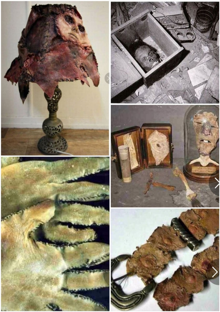 На кухне стояла миска, наполненная человеческими носами. На верёвке сушились губы. Стулья были обиты кожей. На стенах висели аккуратно выделанные "маски" из женских лиц, накрашенные и с румянами, словно их обладательницы только что вернулись с вечера.
