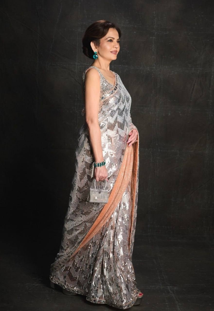 Нита Амбани дополнила свой образ эффектным металлизированным сари от того же бренда и изысканными серьгами и браслетом с изумрудами.