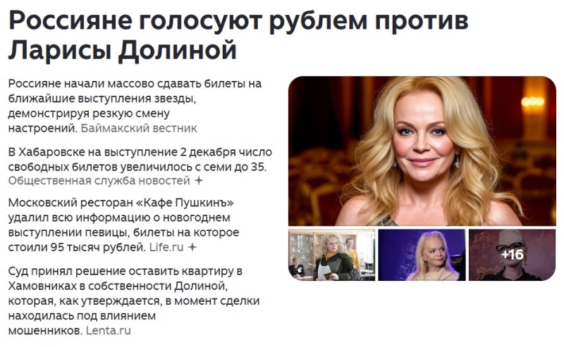 Misa, вы же не знаете сколько бабла у нее за бугром, и как говорил Бжезинский -"пока в американских банках лежит $500 млрд., принадлежащих российской элите. А потом добавил: вы еще разберитесь, чья это элита – ваша или уже наша. Эта элита никак не связывает свою судьбу с судьбой России." Могли упереться что она на патриотической теме подняла хорошо бабла, это уже репутация всей нашей провластной культуре, которая поддерживала своих - Пугачёву, Хазанова, а они валят из страны,я уже не говорю про тех укроевреев которые просто обогатились и сделали себе имя благодаря нашей стране - Роднянские, Квартал 96, с будущим президентом Украины, а если взять во внимание сколько украинцев стало знаменитыми и кормящимися здесь, благодаря России, то это список нескончаемый - Лобода, Сердючка, Виагра, Лолита и далее по списку. Это напрямую затрагивает провластную культурку, которая столько денег в них вложила, а они потом показали себя во всей красе. И дело Долиной больше нанесло удар по государству, судебной системе и тем кто честно купил квартиры, а их потом кинули, о каком отвлечении внимания вы говорите, это наоборот только подстёгивает недовольство людей, которые это наблюдают, плюс ко всему идет ужесточением налоговой политике, рост цен. И я не вижу тут ничего криминального, для этого сайта, о чем мы должны молчать, сайт рассчитан на аудиторию нашей страны.