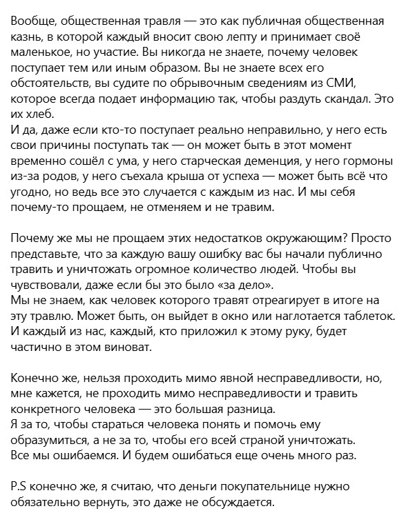 Я в шоке от защитников Долиной. Она продала квартиру, деньги получила от покупательницы, а потом квартиру отжала. У покупательницы ни денег, ни квартиры. Это как? При чем здесь «мы все ошибаемся»? Ошибка — это не на тот автобус сесть и поехать в другую сторону, а не отжать квартиру. При чем здесь вообще «не прощать недостатков»? Отнять честно купленную квартиру у покупателя — это «недостаток»? Вот лицемерка ведь.