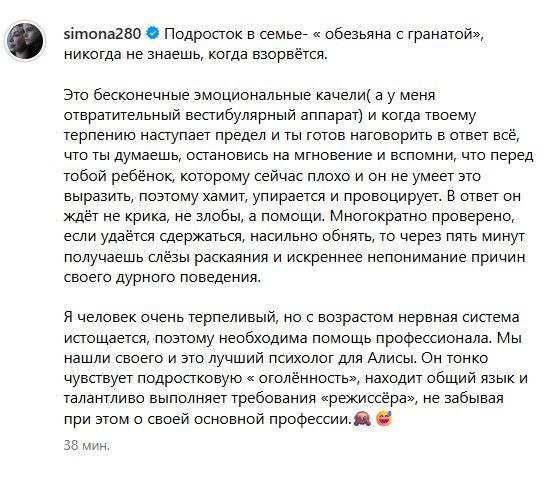 Видать, Алиса стала бунтовать, бабушка не справляется. Не обязательно об этом вещать на весь инет, но Симона любит хайп