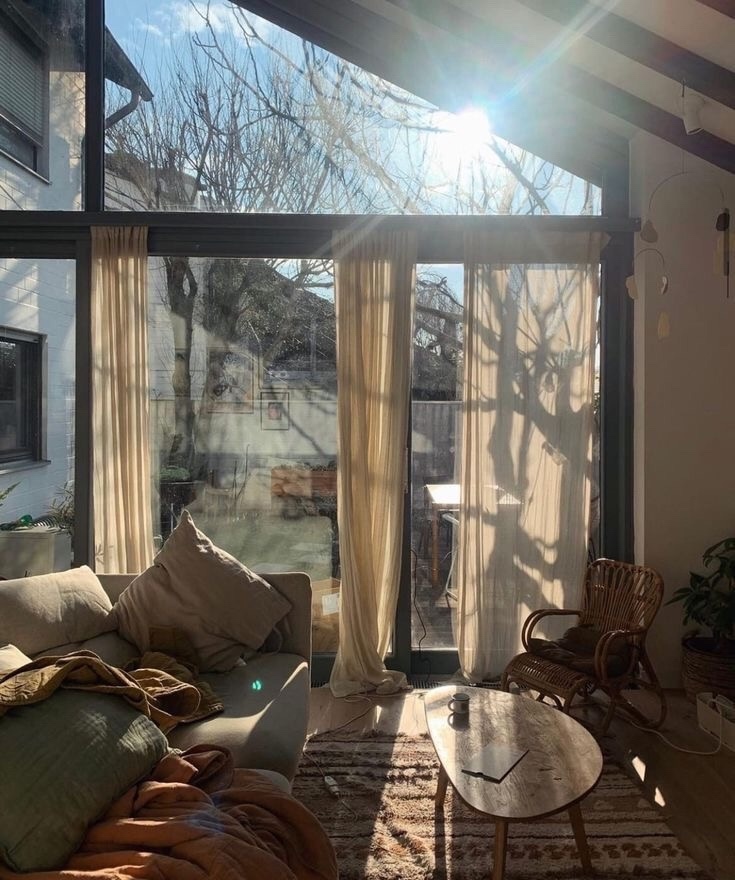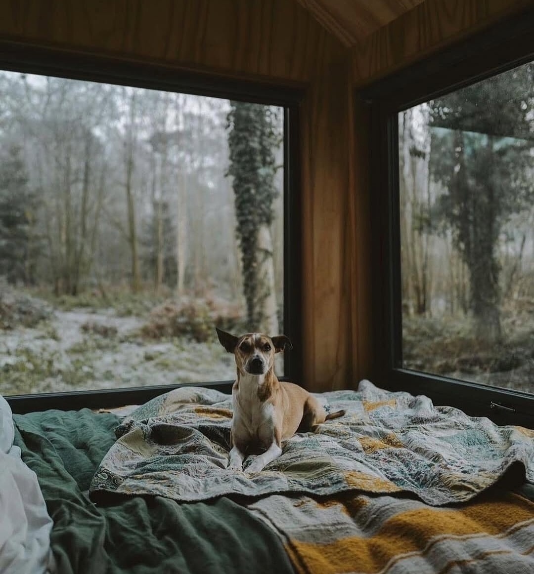 Интересно, на фото, где панорамные окна выходят в лес с двух сторон и пес на кровати лежит, это где такое. Глемпинг или свой дом?