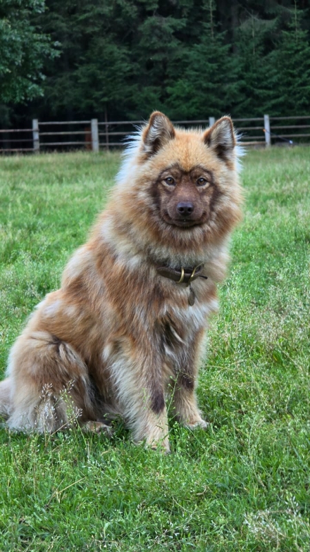 Фото...где пёс, волкособ, наверное, на фоне берез....интересно, не ИИ? т.к. берёзки размытые....но все равно, как красив этот пёс!))))...