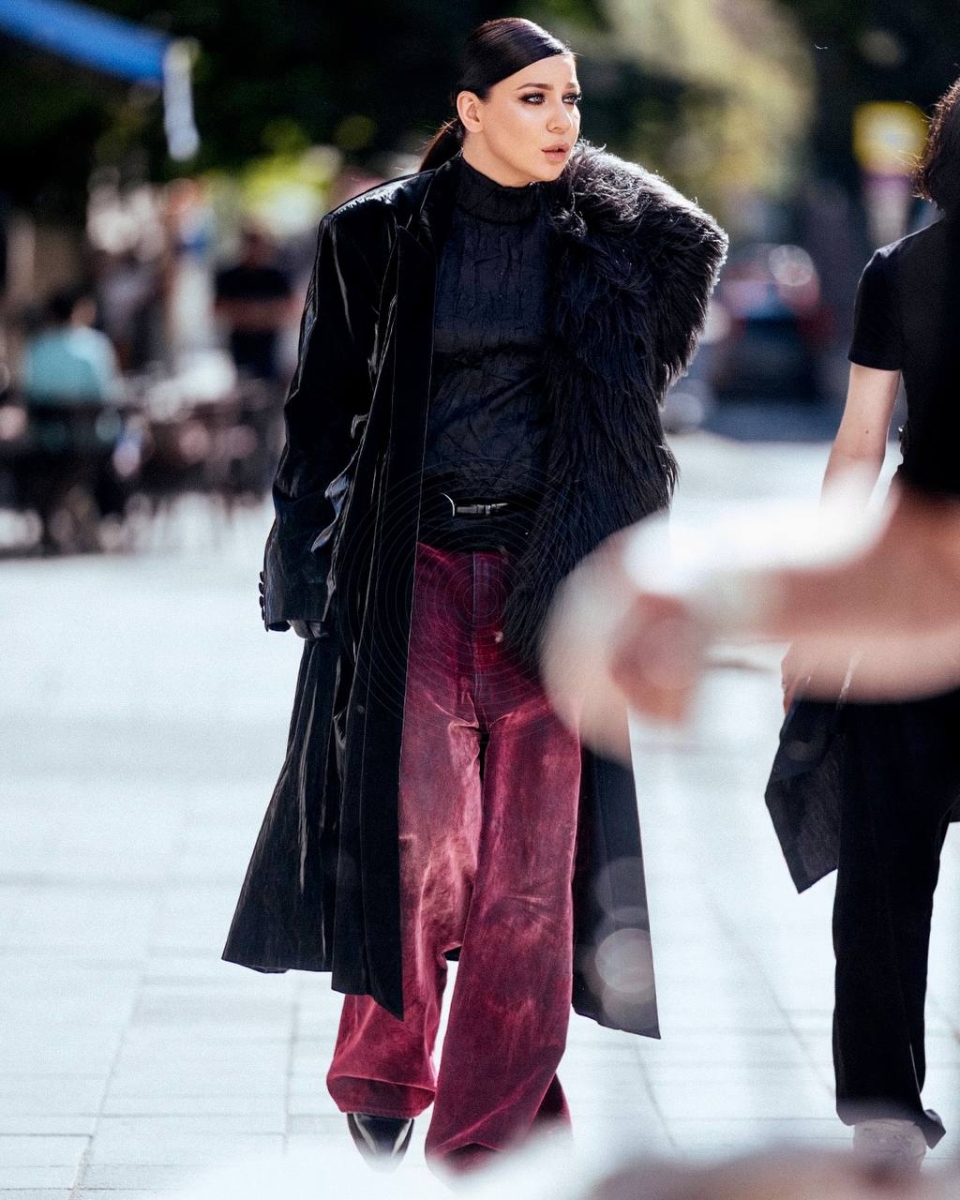 Что за треш в бордовой замшевой куртке? Миссия впихнуть невпихуемое? Новый стилистический приём? Это только на спор можно так одеться.