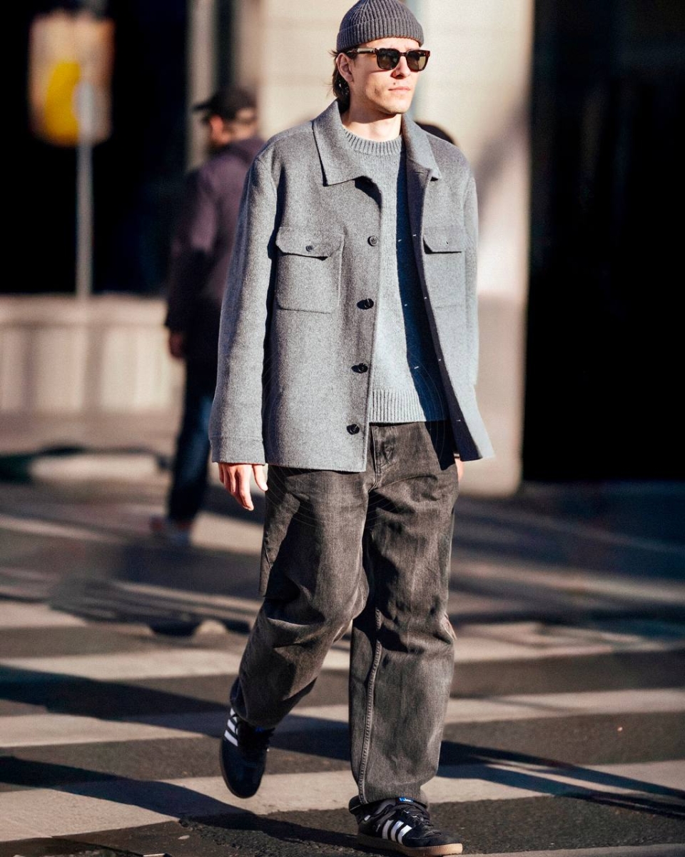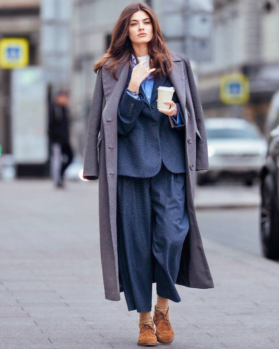 Понравился парень в сером коротком пальто и шапочке докера и девушка-брюнетка в сером длинном пальто и серо-синем костюме с кофе в руках.