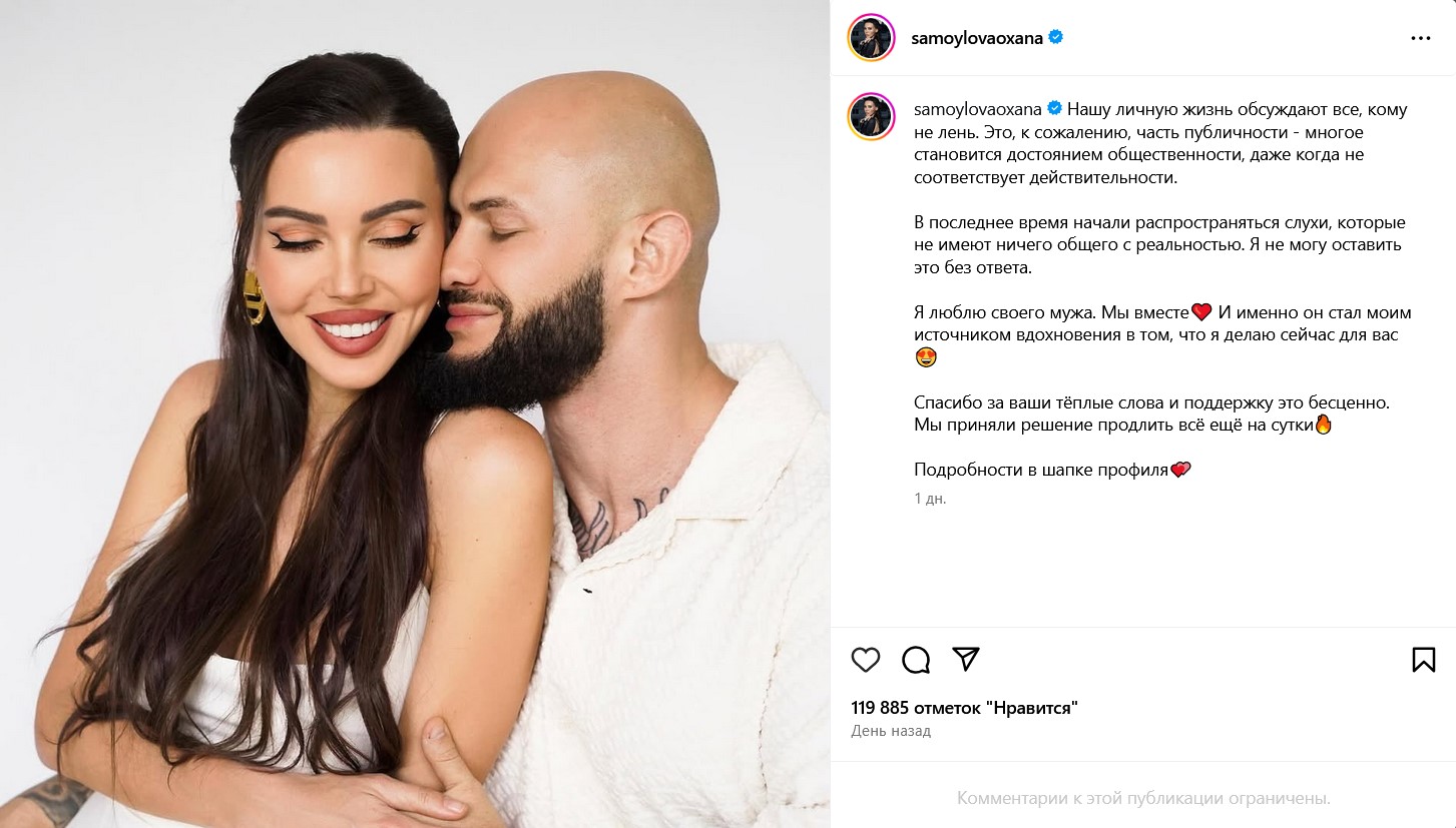 Пока СМИ обсуждают предстоящий развод рэпера Джигана и блогерши Оксаны Самойловой, сама она никак не может определиться, разводятся они или нет. Два дня назад пишет, что это не так: