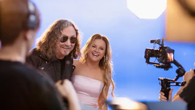 На видео блогерша обнимает мужа и танцует с ним среди сверкающих янтарных панелей.