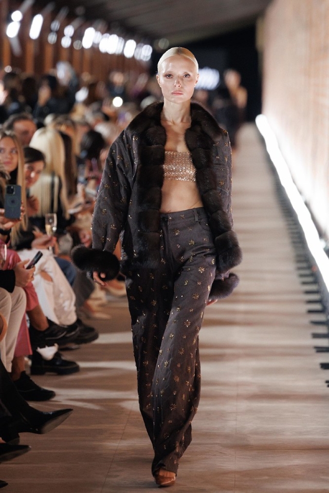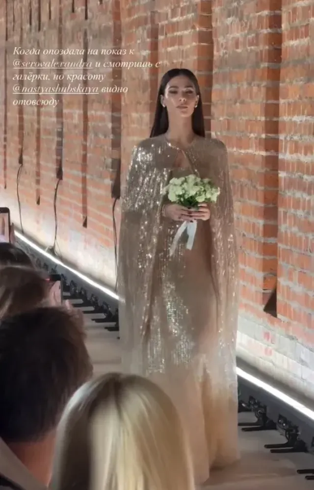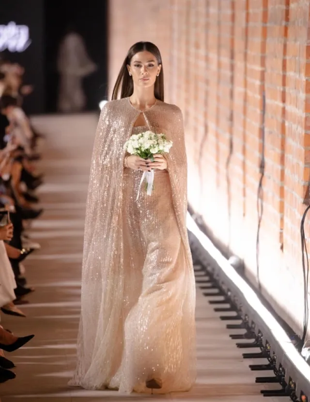 А муза бренда, Анастасия Шубская, супруга прославленного хоккеиста Александра Овечкина, завершила показ эффектным появлением в образе невесты – в роскошном платье с кейпом, из расшитой стеклярусом ткани.