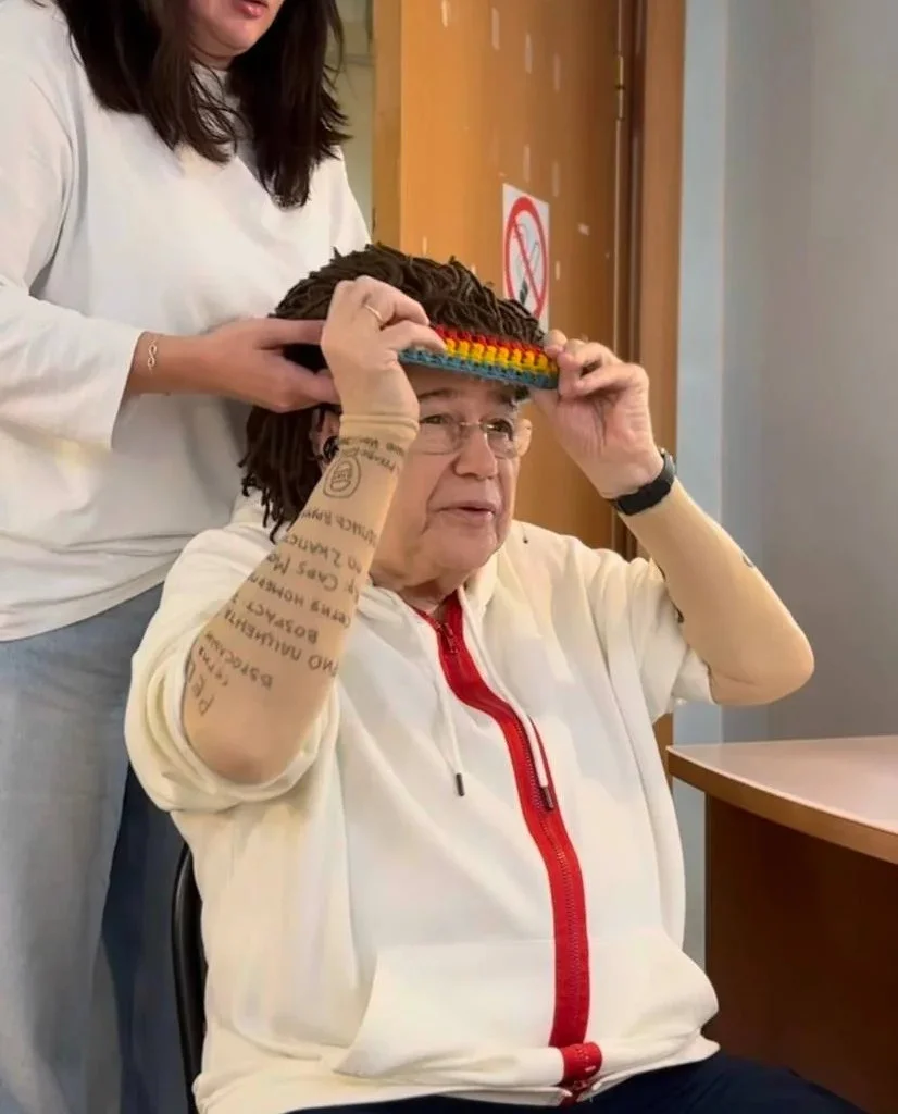 Татьяна Брухунова запечатлела 80-летнего супруга во время подготовки к номеру «Продвинутый дед». Он позировал, сидя в гримерной перед камерой в белой толстовке с красной молнией и очках с прозрачными линзами. Также комик надел специальные рукава с надписями и рисунками, имитирующими татуировки, и примерил парик с дредами и разноцветной вязаной повязкой.