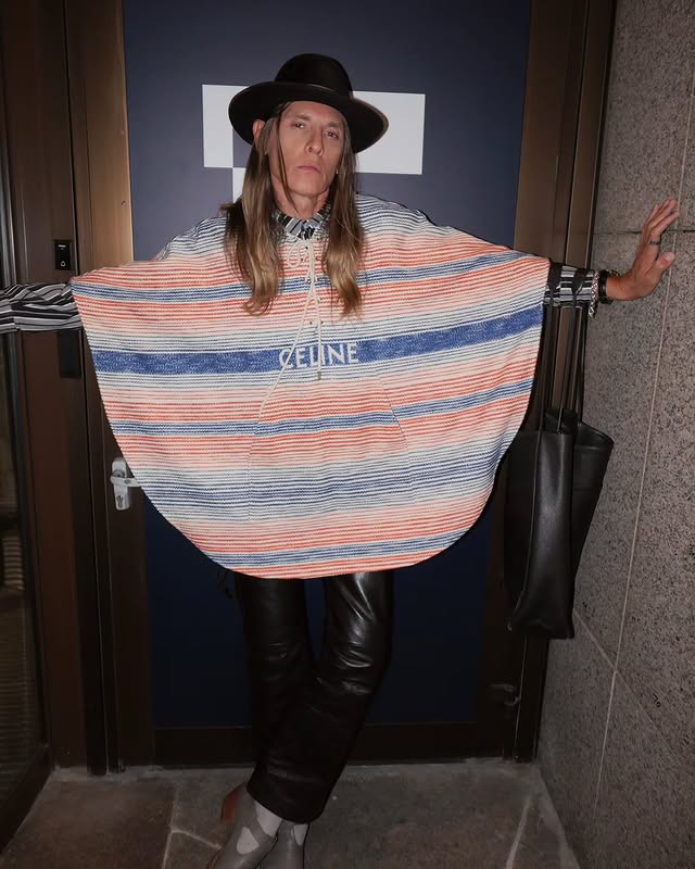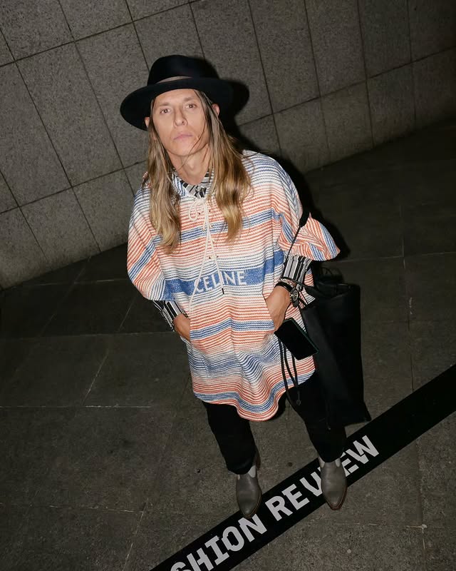 Влад Лисовец на fashion показе РБК в рубашке Kenzo, брюках и накидке Cceline.