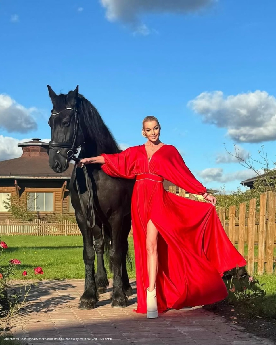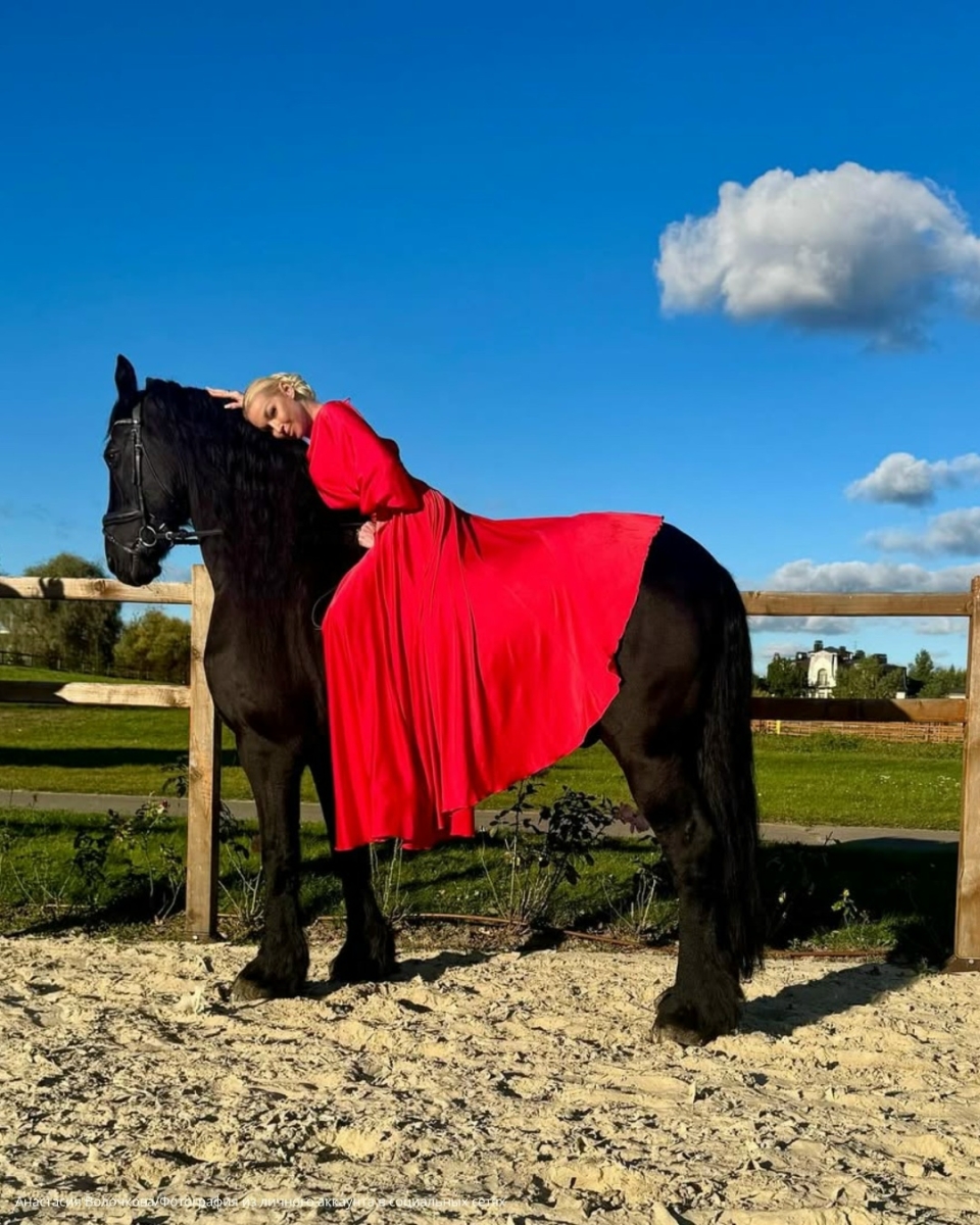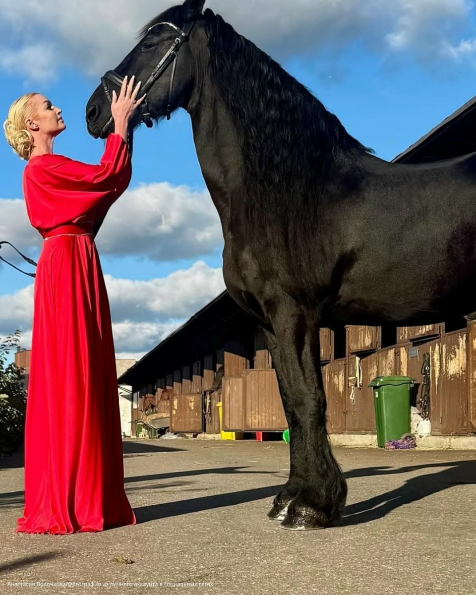 Анастасия Волочкова и её Черный Фриз. «Кони мне идут», — подписала кадры балерина.