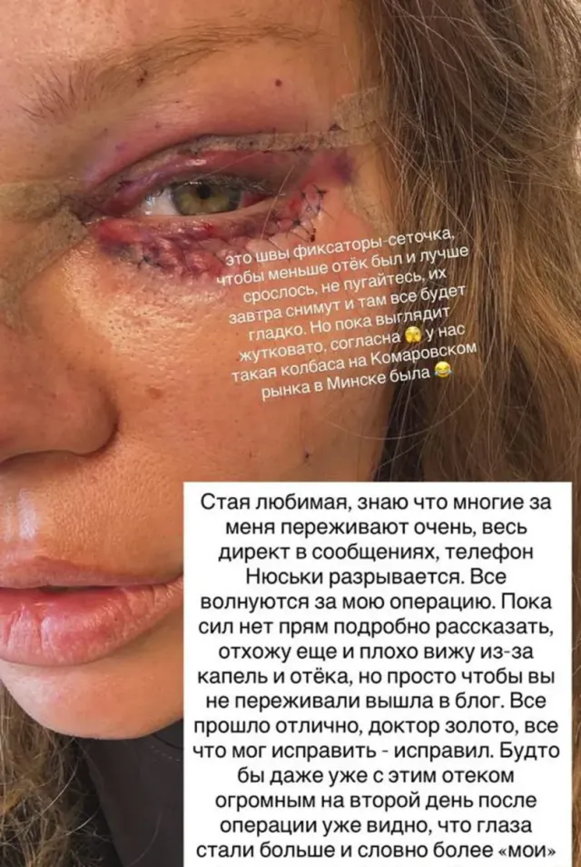 Рита Дакота опубликовала фото после пластической операции со швами-фиксаторами в виде сеточки на глазах. Как объяснила артистка, врач сделал фиксаторы, чтобы у нее был меньше отек. Певица уверила, что их снимут завтра. Артистка согласилась с поклонниками, что выглядит «жутковато». Она пошутила, что сейчас похожа на колбасу с рынка. На данный момент Дакота восстанавливается после операции. "Отхожу еще и плохо вижу из-за капель и отека, но просто, чтобы вы не переживали, вышла в блог. Все прошло отлично, доктор — золото, все, что мог исправить — исправил. Будто бы даже уже с этим огромным отеком на второй день после операции уже видно, что глаза стали больше и словно более “мои”, — поделилась артистка.