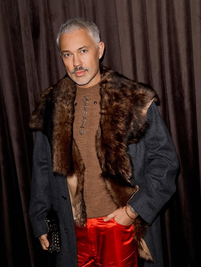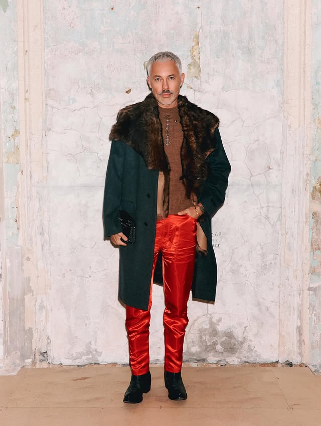 Александр Рогов на показе бренда Sashaverse в одежде Prada c сумкой Hermes.