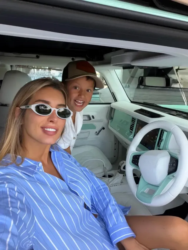 Кети Топурия с сыном Адамом в салоне автомобиля.