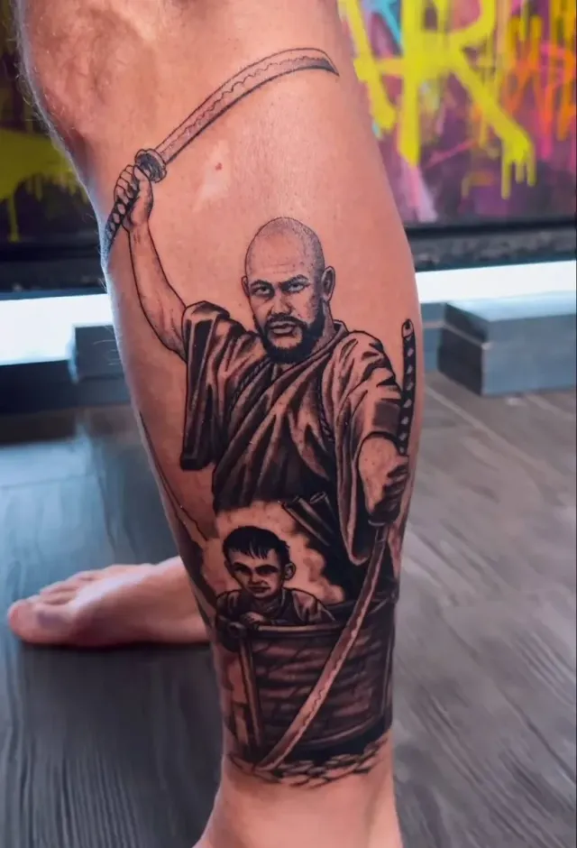 Рэперу сделали на ноге татуировку — самурая, который держит в руках мечи, рядом в костюме война сидит его сын.
