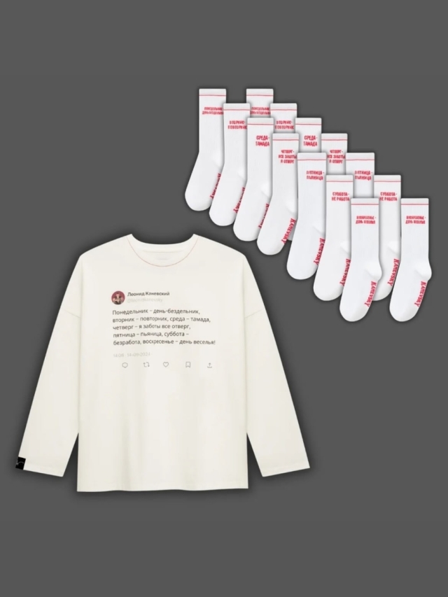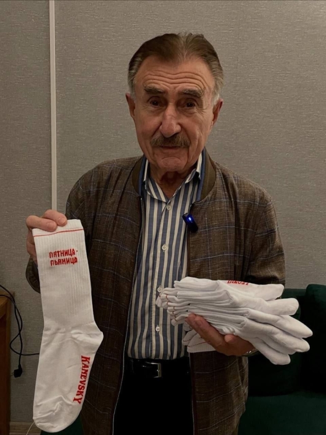 Дочь Леонида Каневского Наталья - художник по костюмам и давно живет с мужем и дочерью в Израиле. Наталья выпустила футболки с изображением отца, а теперь в продажу поступили носки по мотивам популярного отрывка из "Следствие вели": "Понедельник — день-бездельник, вторник — повторник, среда — тамада, четверг — я заботы все отверг, пятница — пьяница, суббота — безработа, воскресенье — день веселья!" Без длинных предисловий: берем!