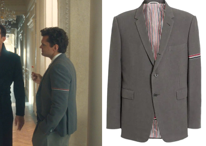 Thom Browne 4-Bar stripe single-breasted blazer-$2,431 and Thom Browne RWB stripe necktie-$340 and Thom Browne V-neck cotton cardigan-$1,321 and Thom Browne - Pleated Striped Wool Skirt - Gray-Sold Out