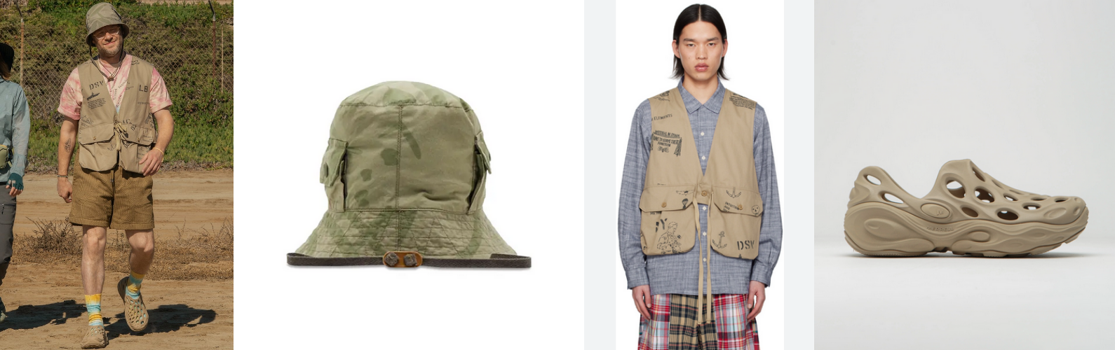 Engineered Garments Explorer Hat 'Khaki/Olive Leaf Print'-Sold Out and engineered garments khaki graffiti vest-Sold Out and Merrell Beige Hydro Moc Water Shoes-Sold Out
