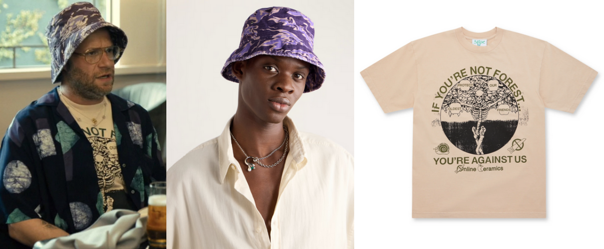 Acne Studios Camo Bucket Hat-$210 and Online Ceramics Men's Forest Or Against Us T-Shirt Beige-$55
