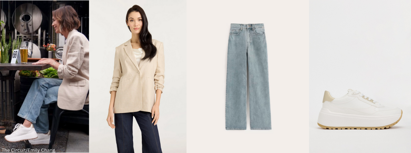 Cinq à Sept ‘Kylie’ blazer and Everlane The Way-High® Sailor Jean 2.0-$148 and Zara platform sneakers
